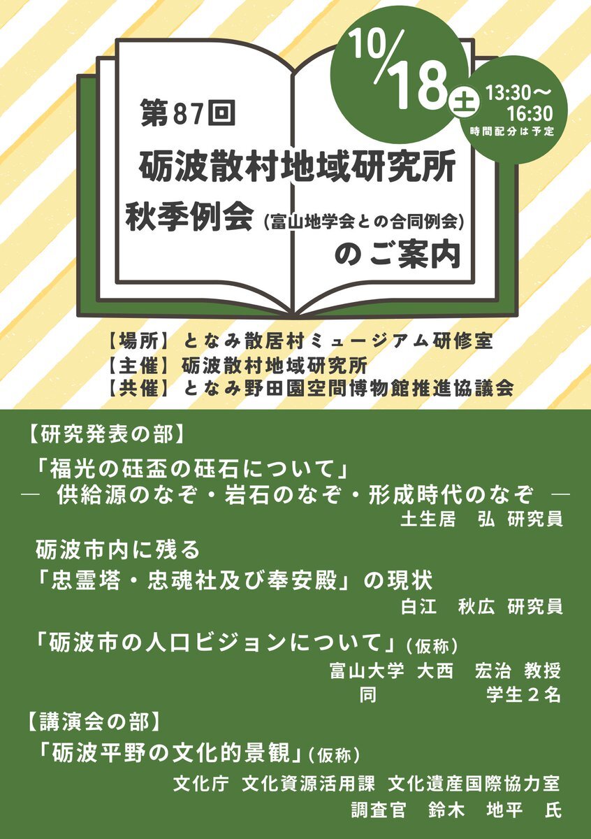 📢第87回砺波散村地域研究所 秋季例会 開催! 今回の講演は、文化庁調査官・鈴木地平氏による 「砺波平野の文化的景観」(仮)です。 世界に誇る散村景観について考える、貴重な機会となります✨ぜひご参加ください! 🔗詳細はこちら sankyo-son.jp/archives/703 #文化庁 #散村 #文化的景観 #講演会 pic.x.com/JQMOIXfM1h