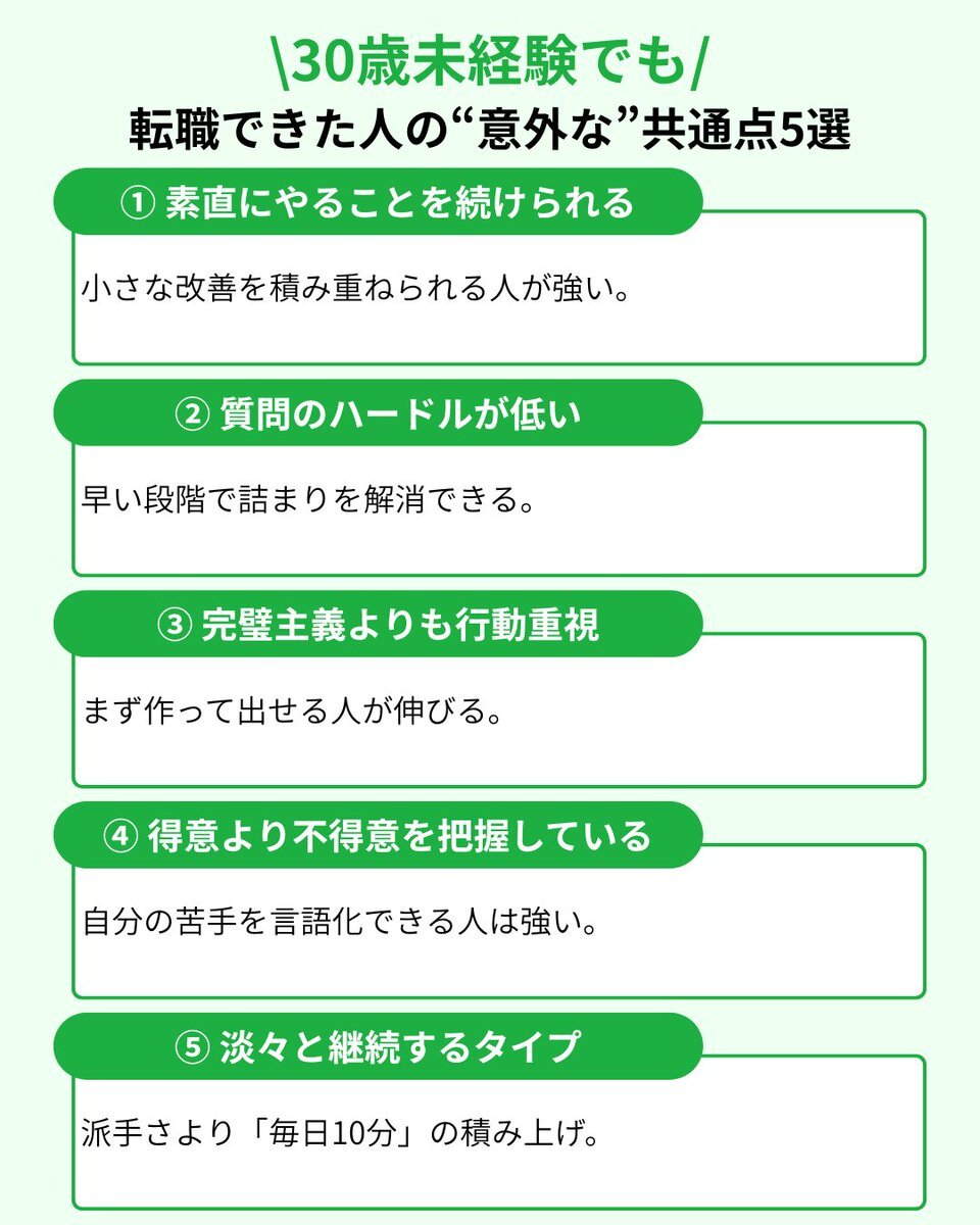 未経験からエンジニア転職した人を見ると 「特別な人なのかな?」と思いがちですが… 実は逆で、 “意外なところ”が共通してることが多いです。 今日はその中でも、 30歳・未経験で内定を取った人に共通する 再現性の高いポイントを5つまとめました👇 #エンジニア転職 #未経験エンジニア #忍者CODE pic.x.com/BtqCT4Y7xK