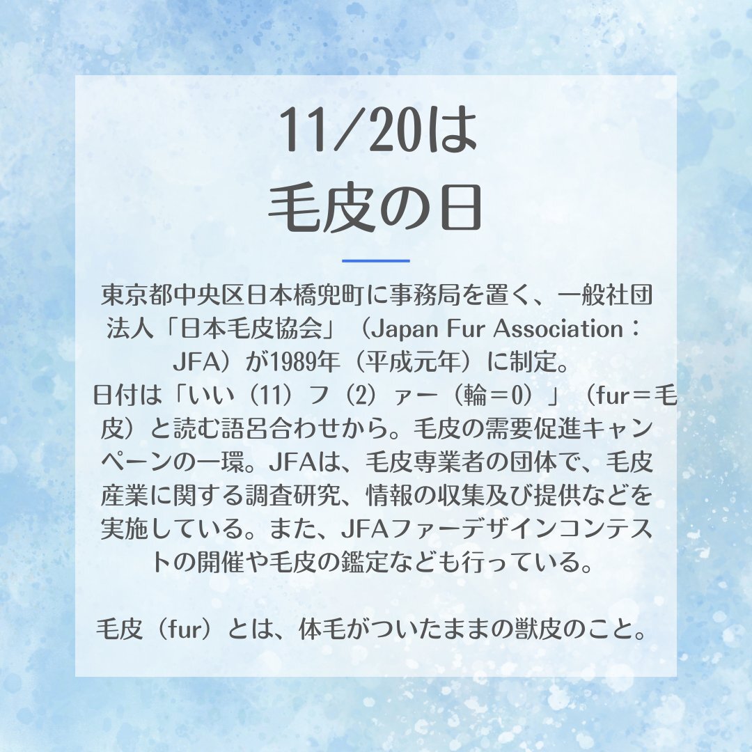 おはようございます😊 11月20日は「#毛皮の日」です✨ 一般社団法人「日本毛皮協会」が制定しました。 「いい(11)フ(2)ァー(0)」と読む語呂合わせから、この日とされています。 #企業公式が朝の挨拶を言い合う #企業公式相互フォロー #企業公式さんと繋がりたい pic.x.com/k4DhAqzEWO