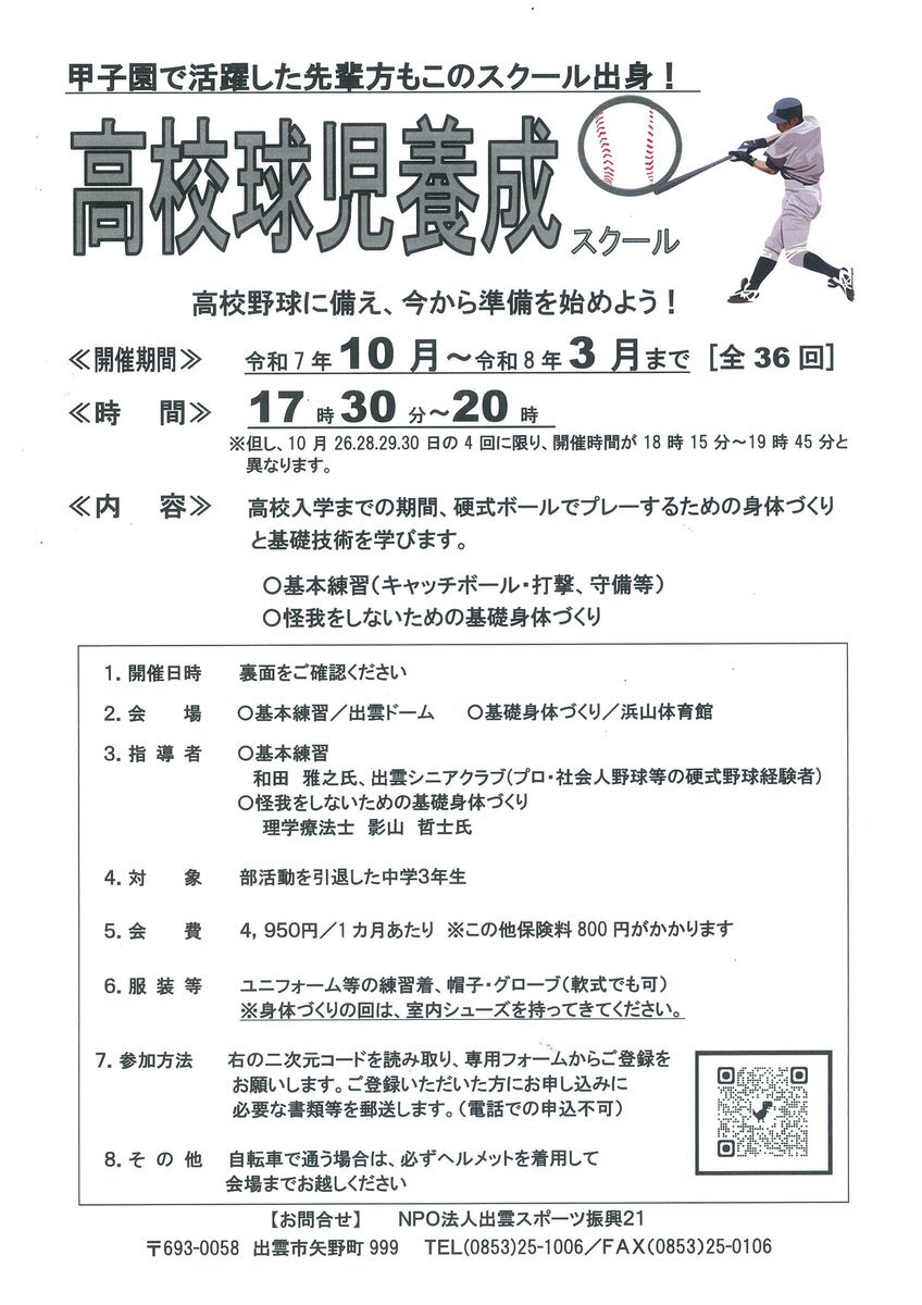 10/26(日)スタート⚾️ 「高校球児養成スクール」参加者受付中! 高校入学までの期間、硬式ボールでプレーするための 基礎技術を学びます。 また、肩回り・下半身の柔軟性や安定性、体幹強化など、理学療法士による身体づくりも紹介! 詳細はコチラ sports21.jp/pages/392/?175… #高校野球 #硬式 #球児 pic.x.com/Ochmzn5NUH
