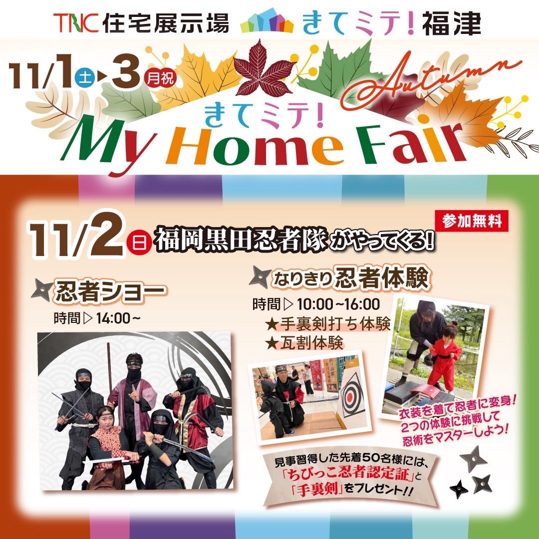 📣11/2(日)限定イベント📣 #福岡黒田忍者隊 が #TNC住宅展示場福津 に登場! 🕑忍者ショー 14:00〜 🌀なりきり忍者体験 10:00〜16:00 (手裏剣・瓦割り体験あり) 先着50名様に「ちびっこ忍者認定証」と「手裏剣」をプレゼント🎁 参加無料🙌 ぜひご家族でどうぞ! #ワーサル #worsal pic.x.com/0GLqT9D98U