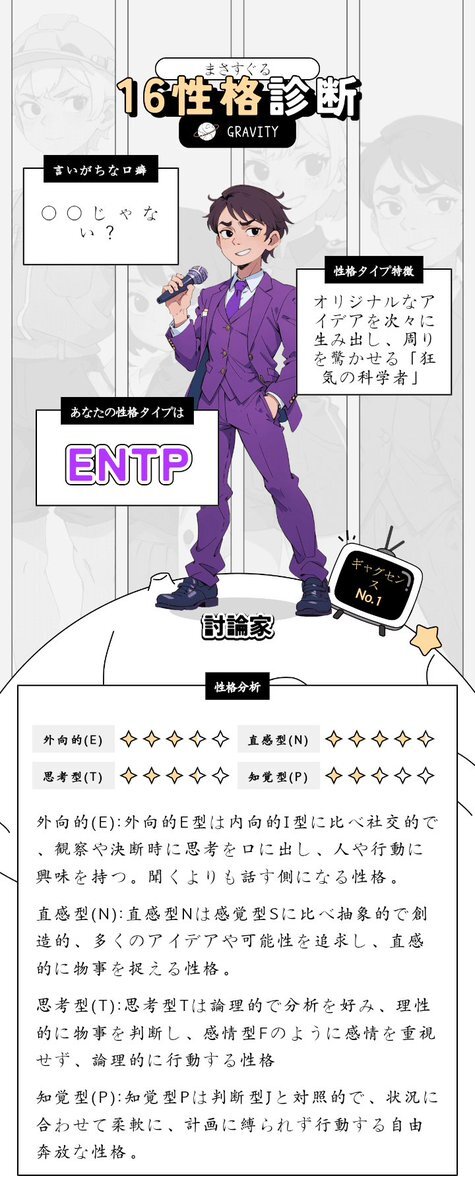 推しとの相性診断もできる #GRAVITY16性格診断❗️❓ 私の結果は#ENTP❗️ ゾクッとするほど当たるから、みんなも試してみて💫 h5.gravity.place/mbtiExam?f=154…