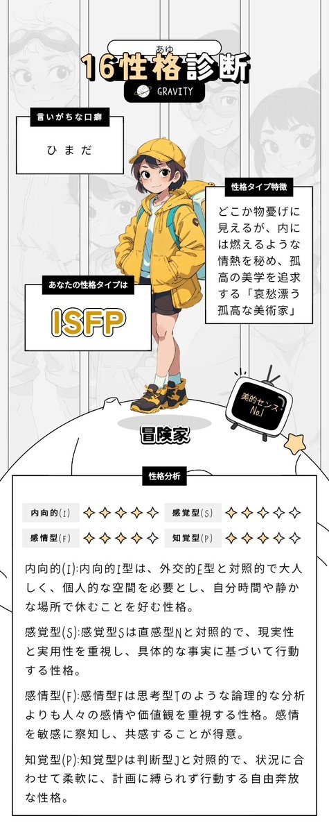 推しとの相性診断もできる #GRAVITY16性格診断❗️❓ 私の結果は#ISFP❗️ ゾクッとするほど当たるから、みんなも試してみて💫 api.gravity.place/gravity/url/3v…