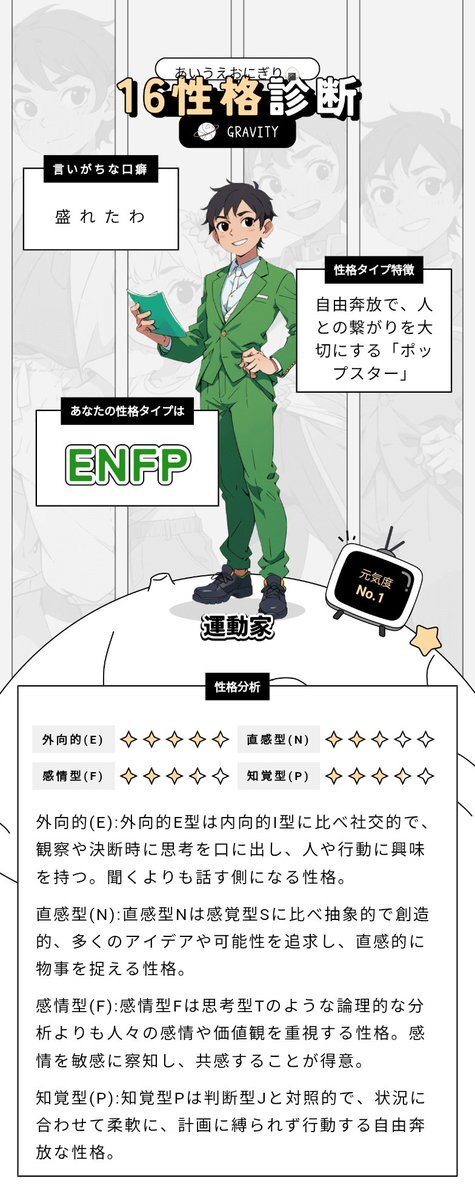推しとの相性診断もできる #GRAVITY16性格診断❗️❓ 私の結果は#ENFP❗️ ゾクッとするほど当たるから、みんなも試してみて💫 api.gravity.place/gravity/url/cJ…