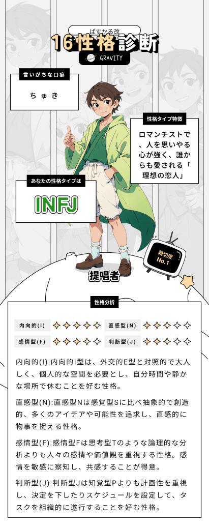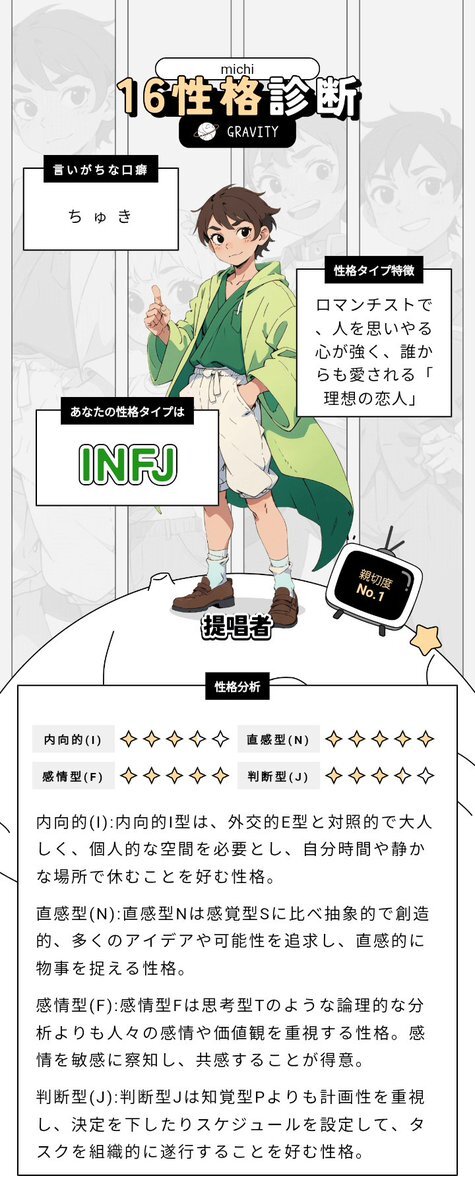 推しとの相性診断もできる #GRAVITY16性格診断❗️❓ 私の結果は#INFJ❗️ ゾクッとするほど当たるから、みんなも試してみて💫 api.gravity.place/gravity/url/b5…