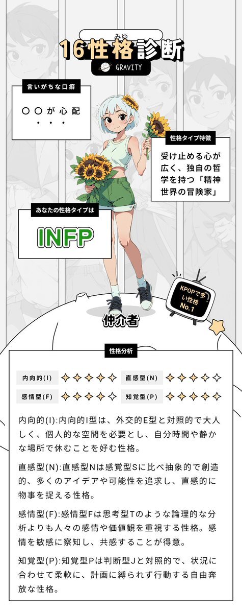推しとの相性診断もできる #GRAVITY16性格診断❗️❓ 私の結果は#INFP❗️ ゾクッとするほど当たるから、みんなも試してみて💫 api.gravity.place/gravity/url/4h…
