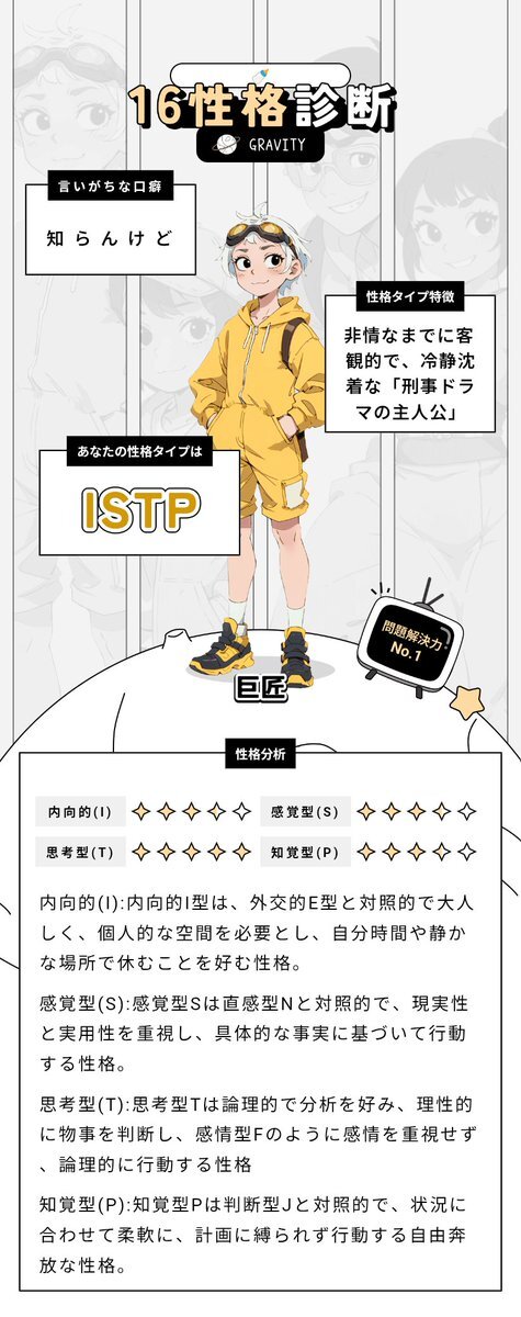 推しとの相性診断もできる #GRAVITY16性格診断❗️❓ 私の結果は#ISTP❗️ ゾクッとするほど当たるから、みんなも試してみて💫 api.gravity.place/gravity/url/jF…