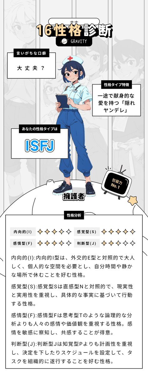 推しとの相性診断もできる #GRAVITY16性格診断❗️❓ 私の結果は#ISFJ❗️ ゾクッとするほど当たるから、 みんなも試してみて💫 api.gravity.place/gravity/url/rs…