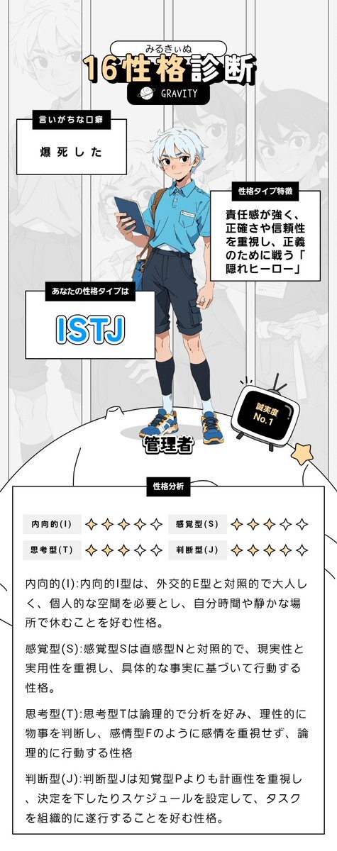 推しとの相性診断もできる #GRAVITY16性格診断❗️❓ 私の結果は#ISTJ❗️ ゾクッとするほど当たるから、みんなも試してみて💫 api.gravity.place/gravity/url/Az…