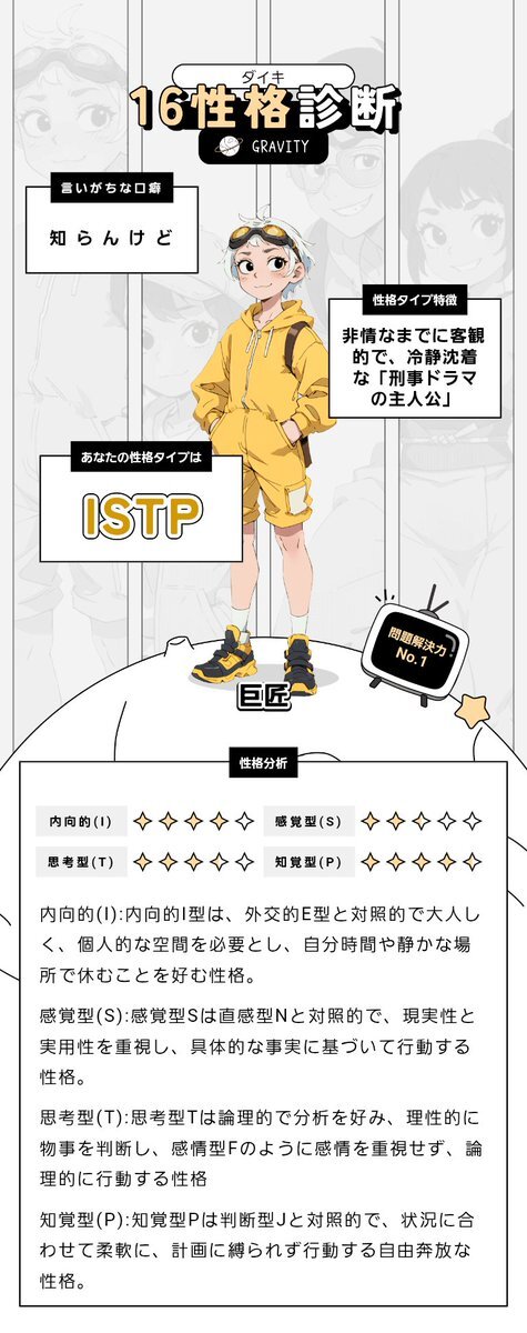 推しとの相性診断もできる #GRAVITY16性格診断❗️❓ 私の結果は#ISTP❗️ ゾクッとするほど当たるから、みんなも試してみて💫 api.gravity.place/gravity/url/7a…