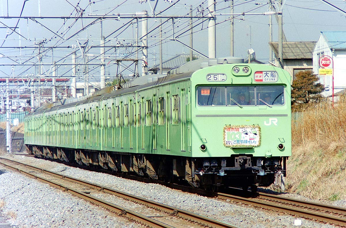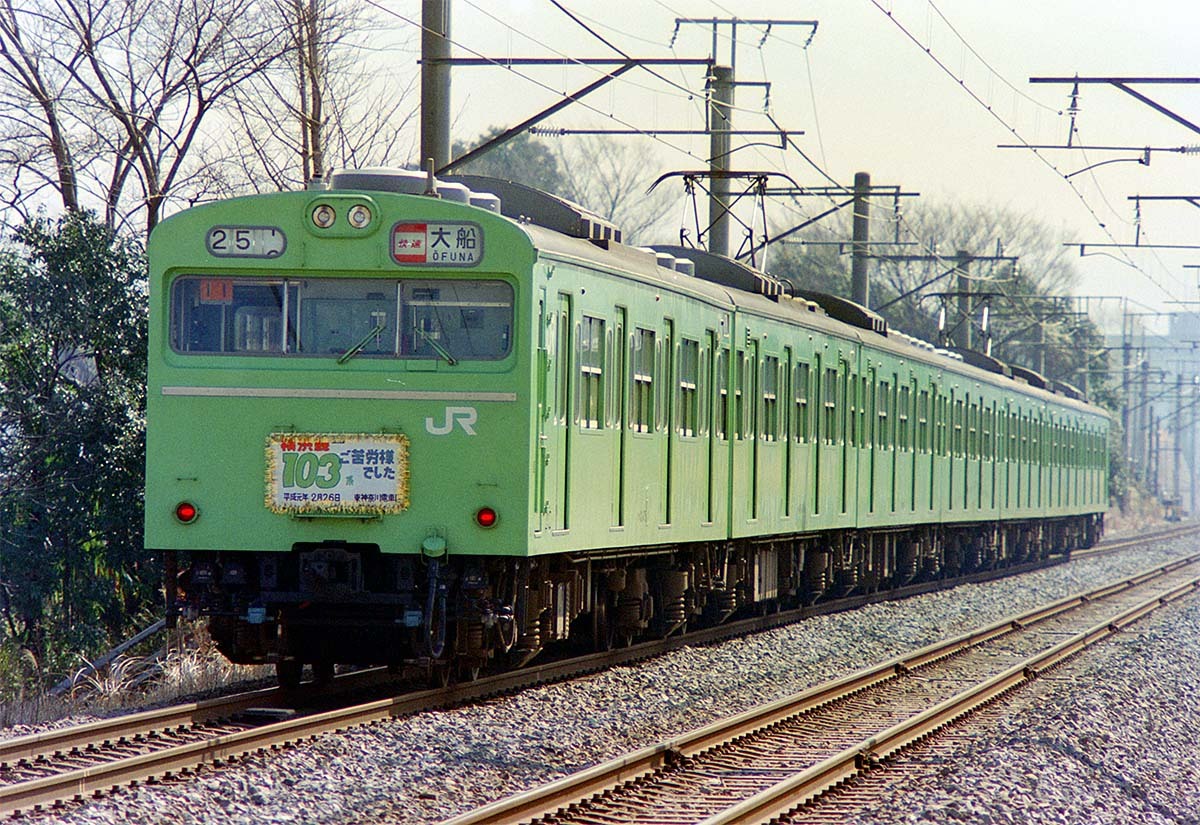 ★JR横浜線103系 103系引退記念ヘッドマークを掲げた編成です。205系への置き換えは半年程度で実施されたと思います。1989年2月 #JR東日本 #JR横浜線 #横浜線 #103系 #十日市場駅 #中山駅 pic.x.com/Q3xOEjDmxQ