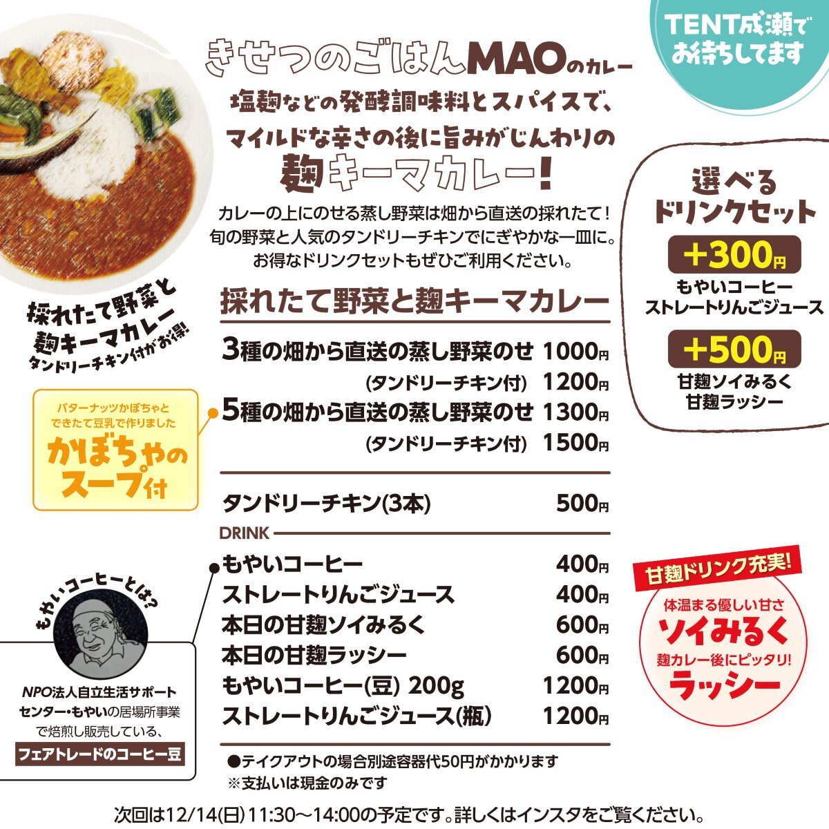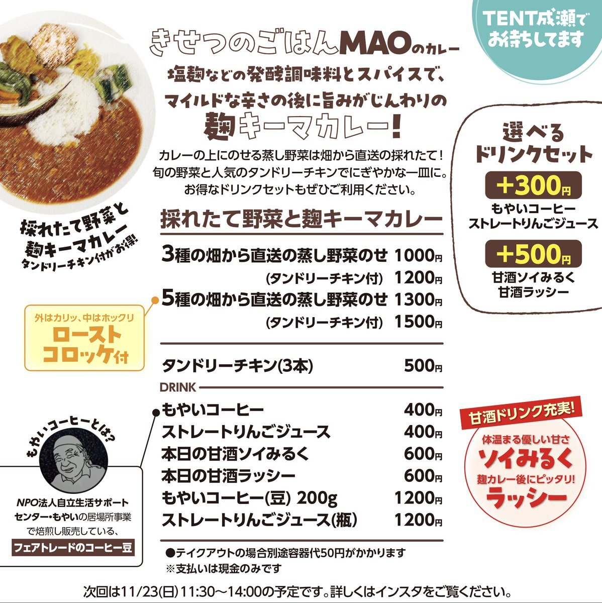 麹キーマカレーの販売が決定! 日程:11/3(月) 販売時間:11:30-14:00 #東京都 #町田市 #成瀬 #南成瀬 #JR横浜線 #徒歩1分 #レンタルキッチン #シェアキッチン #ランチ #カレー #発酵 # #チキン pic.x.com/EldhJ7rO6L