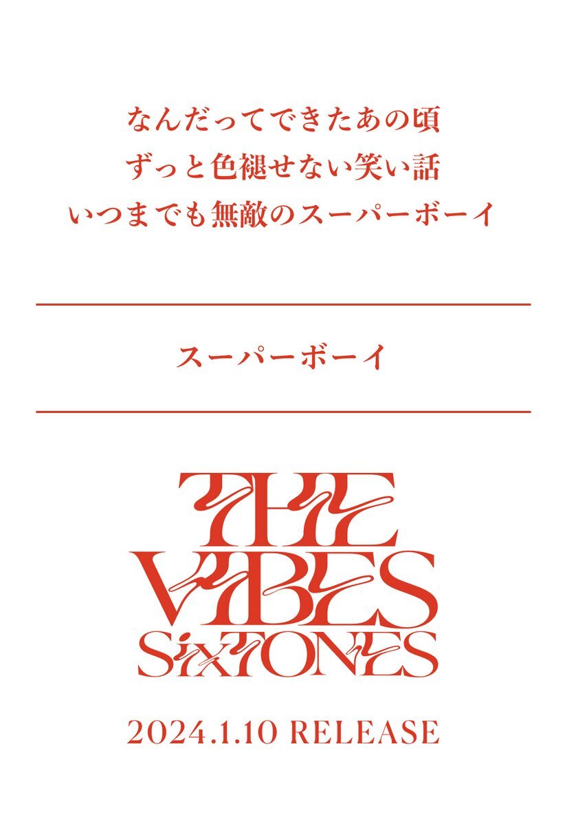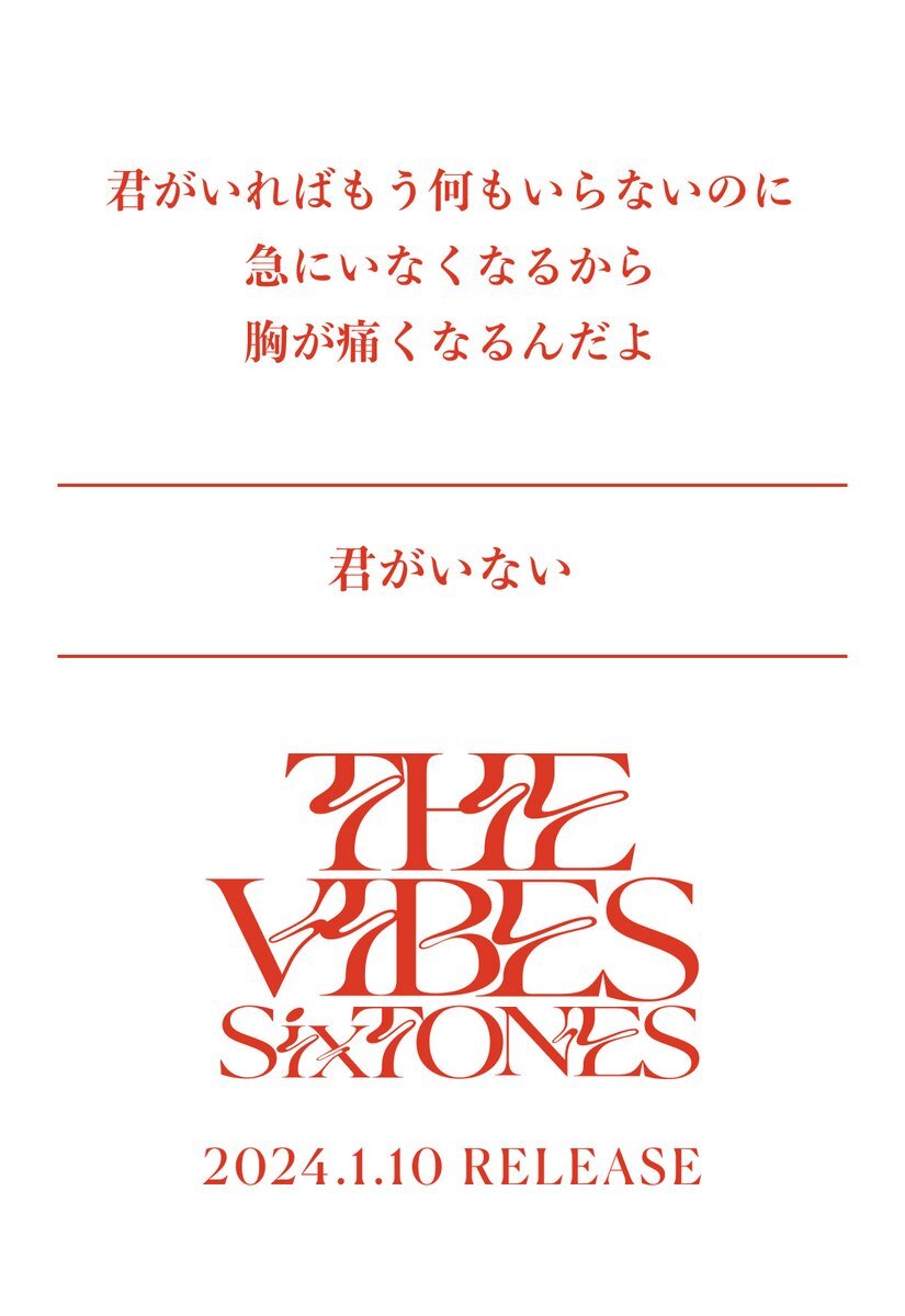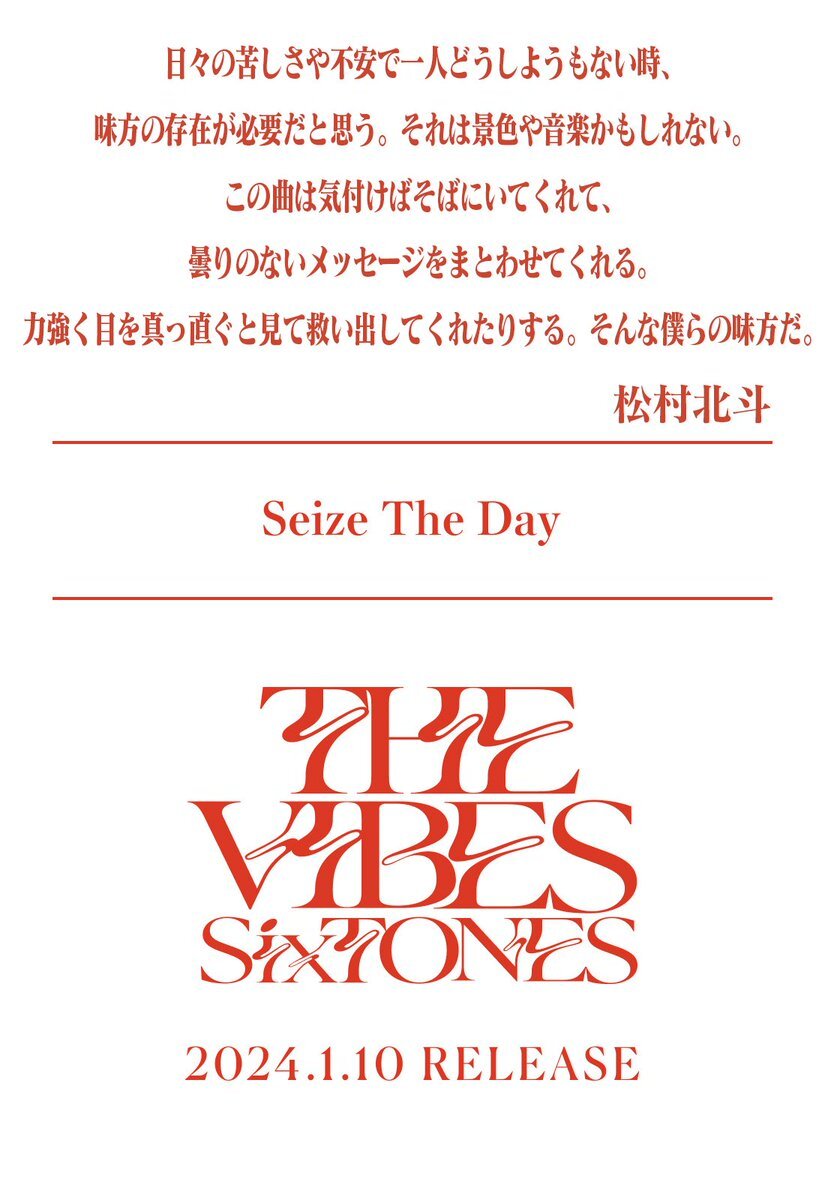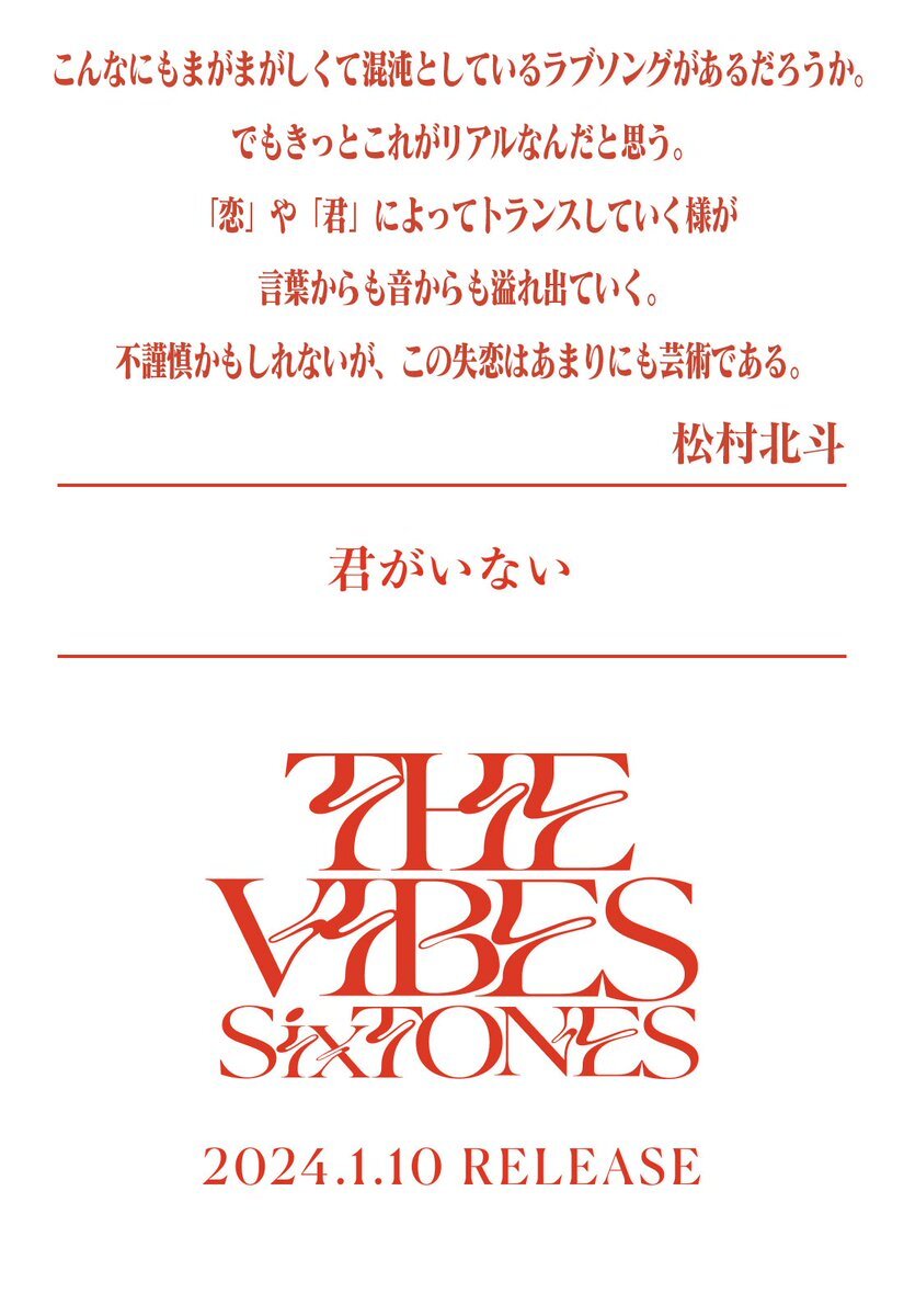 —————— 2024年1月10日発売 SixTONES 4th Album「THE VIBES」 松村北斗 Hokuto Matsumura —————— ▼リリース詳細はこちら sixtones.jp/discography/d0… 💿sixtones.lnk.to/THE_VIBES_CD #SixTONES_THEVIBES pic.x.com/CZGlFWToPq