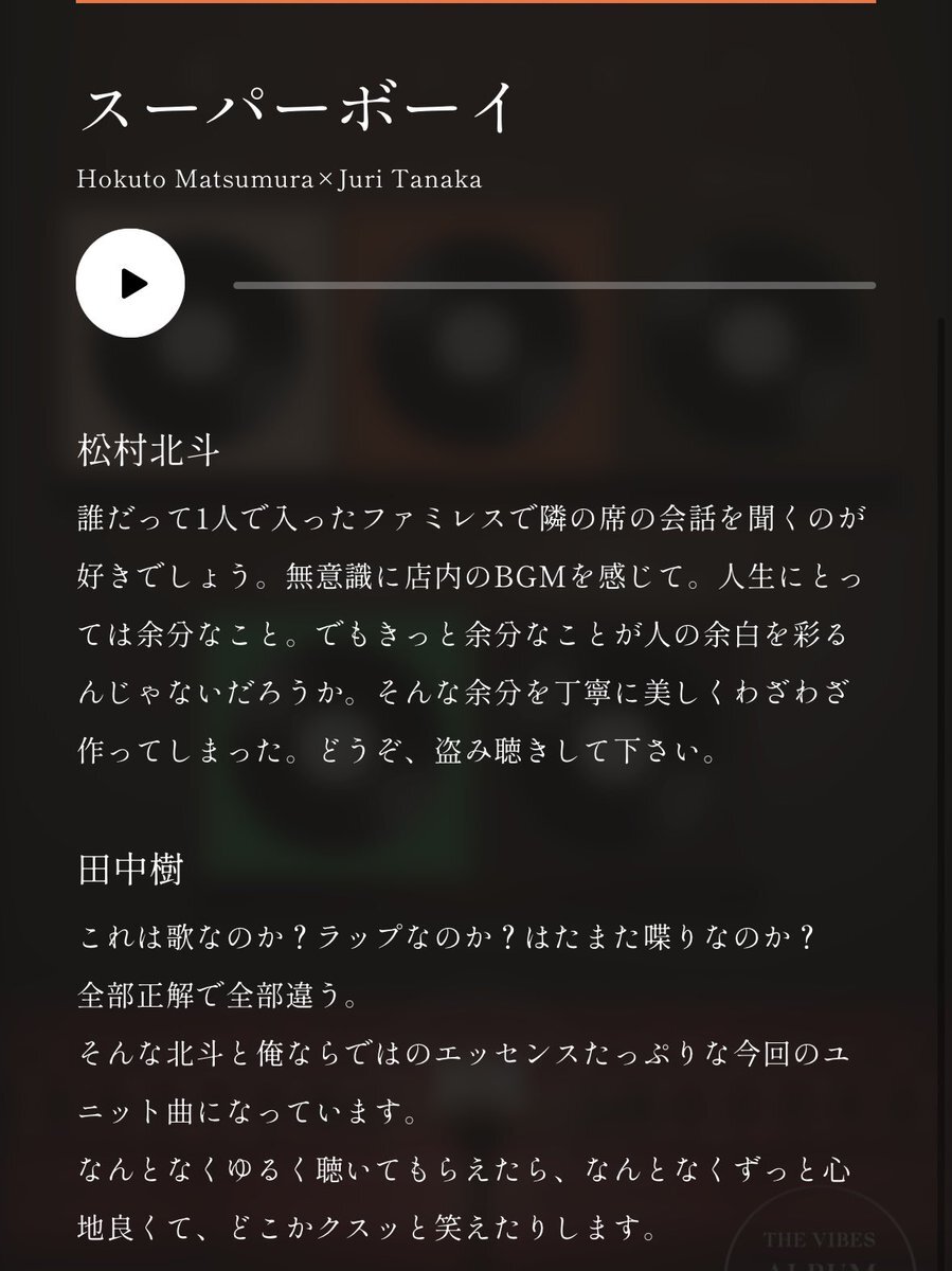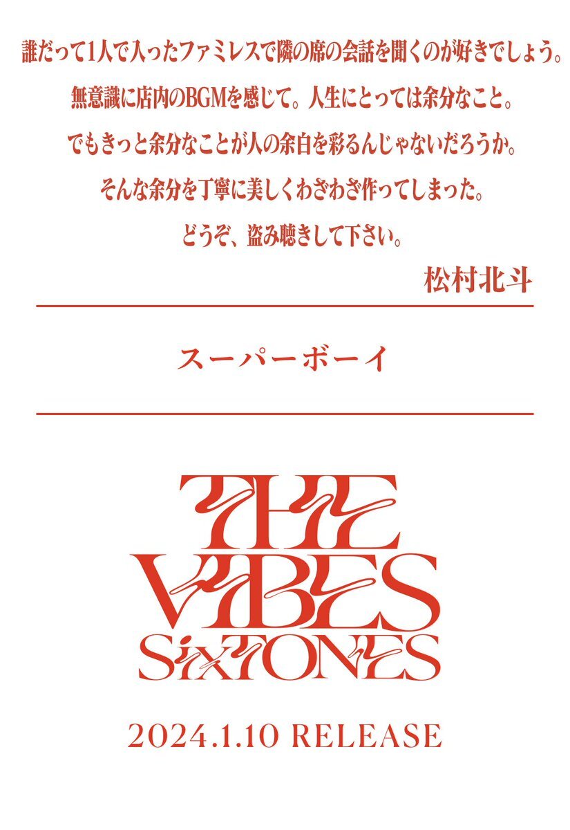 —————— 夕方6時、 メンバー6人から送る 「THE VIBES」 セルフライナーノーツ —————— 松村北斗 Hokuto Matsumura ▼詳細・ご予約はこちら sixtones.jp/discography/d0… #SixTONES_スーパーボーイ #SixTONES_THEVIBES pic.x.com/F6969Md9ts