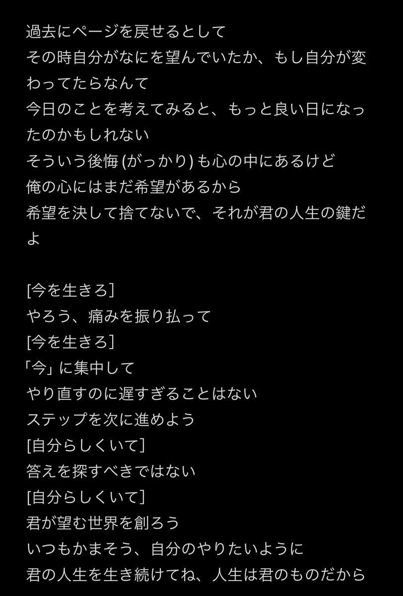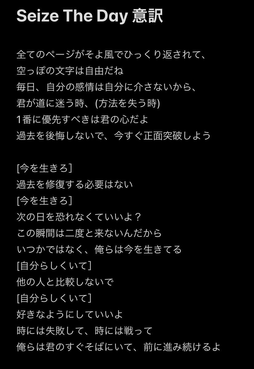 私なりに意訳しました…。 所々間違ってるとは思いますが、刺さる言葉が多い歌詞だったので…是非意味を考えながら聞いてください!!泣けます!! #SixTONES_SeizeTheDay #SixTONES_THEVIBES #SixTONES_VVS pic.x.com/rXhZdQ8tYu