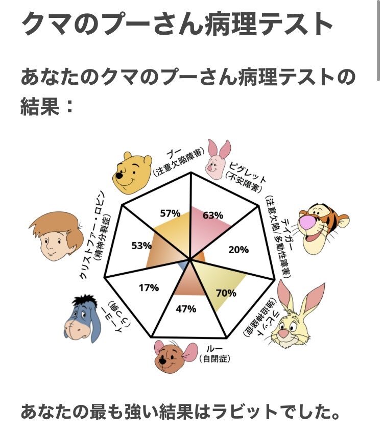 私のクマのプーさん病理テストの結果で私はルーになりました。 idrlabs.com/jp/pooh-pathol… via @idr_labs 「ルーはまだ幼児期にあるため回復の可能性もあり、または彼の診断が注意欠陥/多動性障害に移行する可能性があることを意味します。」無事移行してない?これww