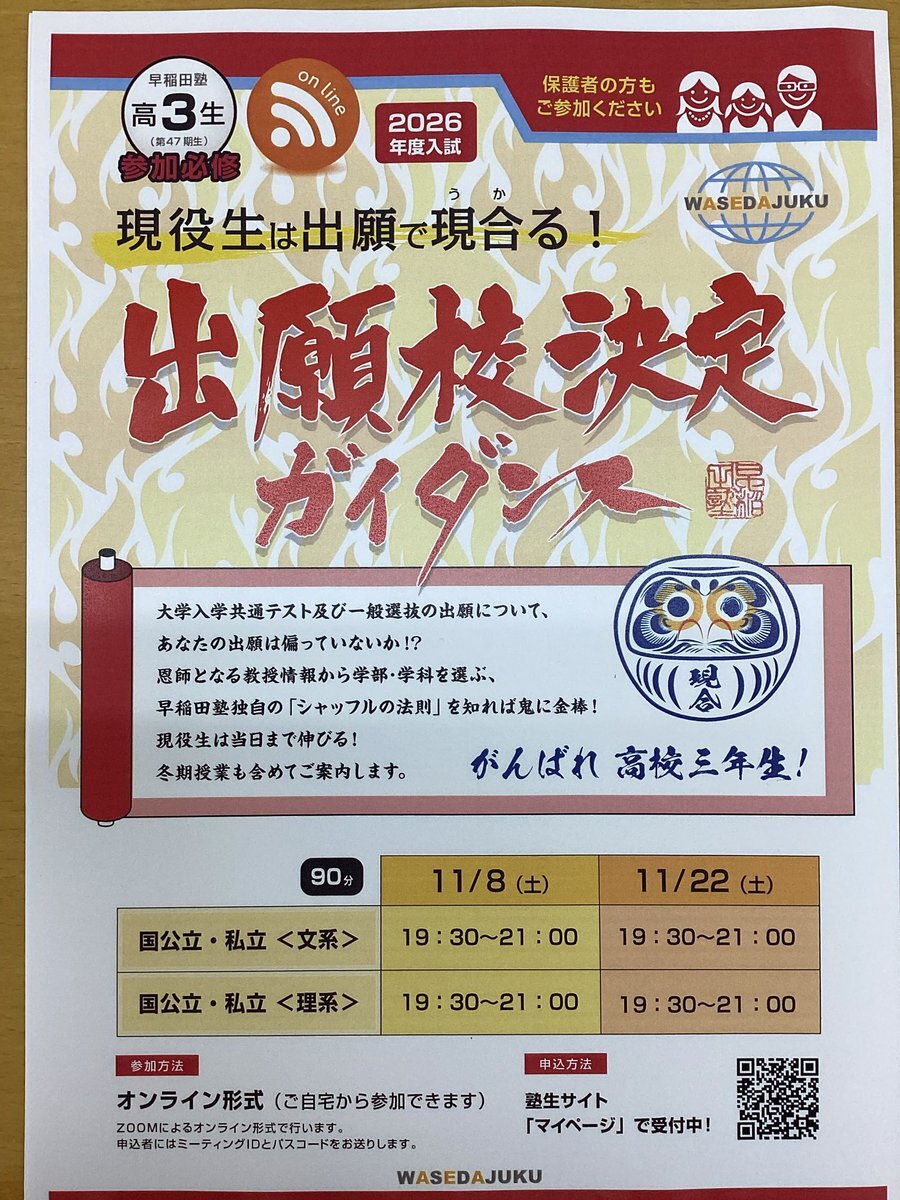 一般受験に向けての準備は進んでいますでしょうか。 出願戦略は受験において非常に大事になってきます! 必ず参加しましょう✨✨ x.com/wasedajuku_f/s…