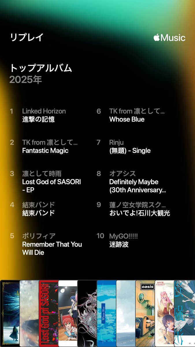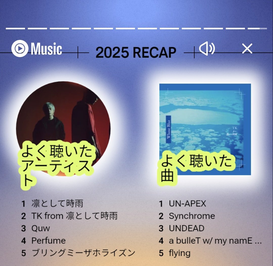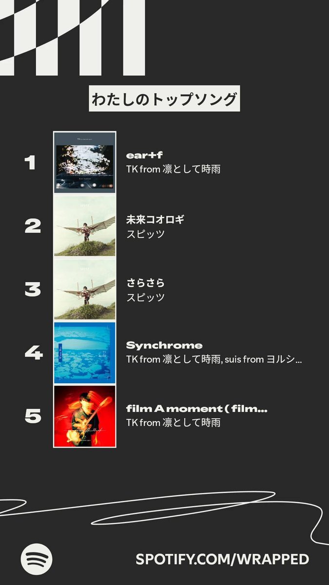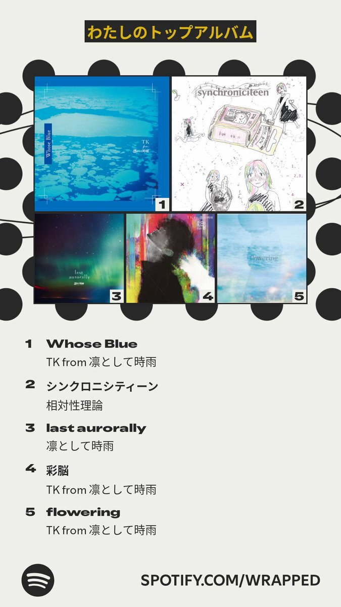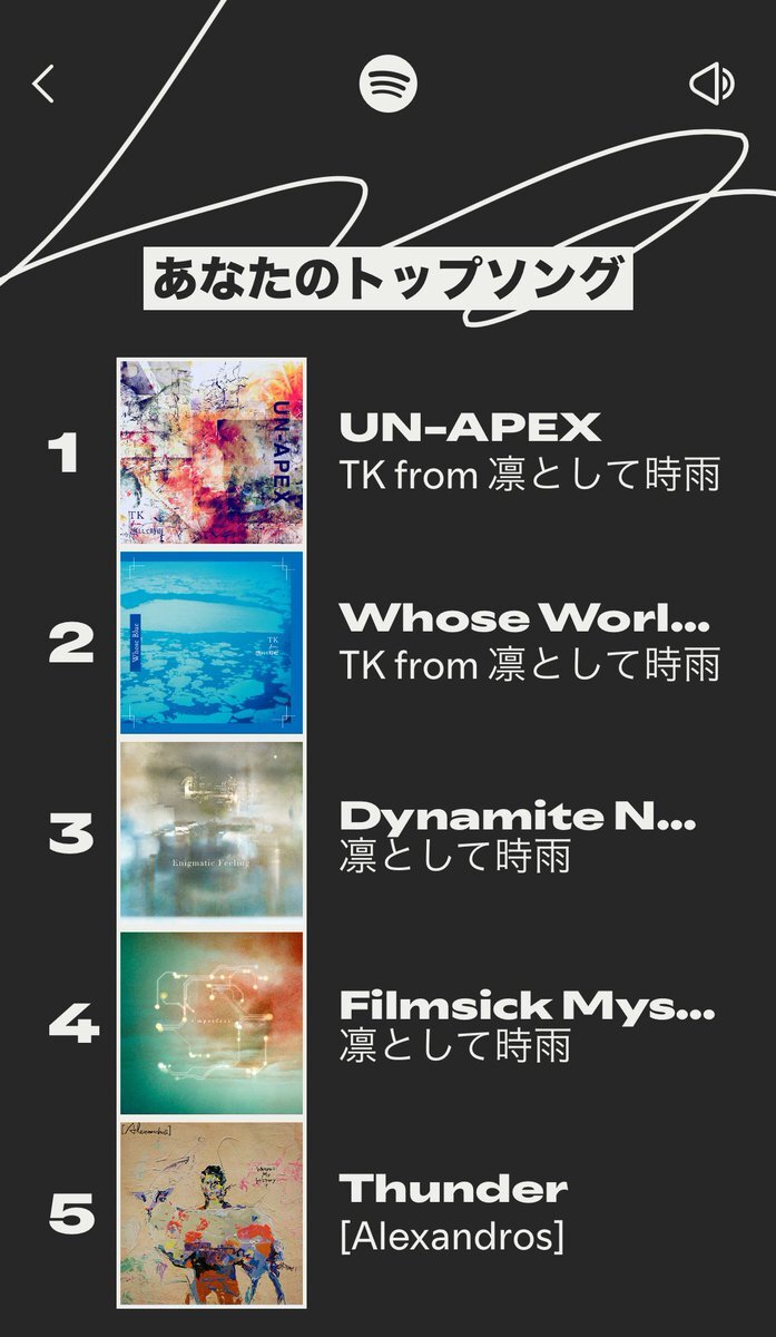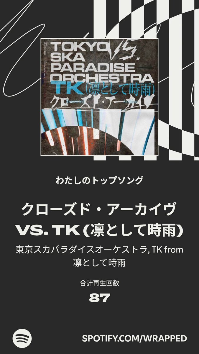 今年のわたしのトップソングは「クローズド・アーカイヴ VS. TK (凛として時雨)」でした。詳しくはわたしの #Spotifyまとめ をチェック spotify.com/wrapped-share/… pic.x.com/KLHtToaVBJ