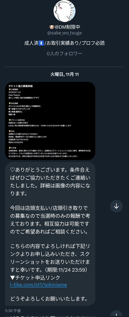 【注意喚起】 🐶@ DM制限中様 (@sake_wo_tsuge) 協力していた申込の当選後に体調不良で入金が遅れる旨をご連絡いただき、その後アカウント凍結で連絡が取れなくなりました。支払は行われておらず、多数の方から同様の被害報告が上がっております。→ #チケット協力 #チケット相互協力