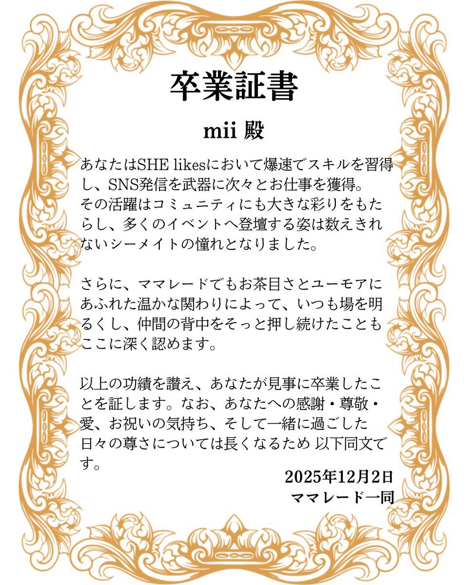 すっごく嬉しいことが…😭 #ママレード がサプライズで 卒業式をしてくれたの😭 卒業証書を読み上げてくれた後 一人一人からのメッセージまで😭 卒業を実感できて、かけがえのない仲間に 出逢えて、この1年は人生の宝物に💐 関わって下さった #シーメイト さん 感謝申し上げます😭 #シーライクス pic.x.com/MHx8eckibZ