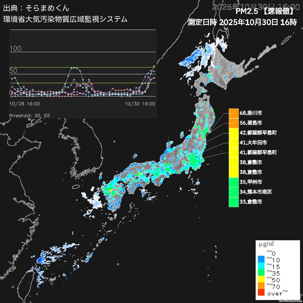 PM2.5と言う名の放射性物質☢️ 各地厳重注意⚠️ 10月30日 PM2.5≧65μg/㎥ 掛川市68 福島市56 都窪郡早島町42 都窪郡早島町41 大牟田市41 国連のディーガル(人口削減)計画 2025年末迄に日本人二千三百万人削減  ビルゲイツが上院議会で人口削減を行なっていた事を認めましたが、米軍が計画進行中 pic.x.com/78MC3kSZrA