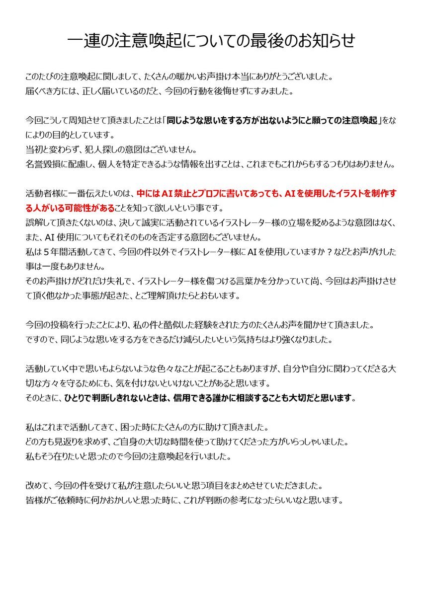 連日お騒がせして申し訳ございません。 先日からの一連の注意喚起について、最後のお知らせを出させて頂きます。 これ以上同じような悲しい思いをされる方が増えないことを願っております。