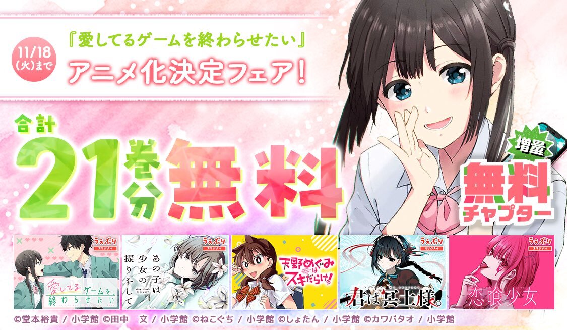 【『#愛してるゲームを終わらせたい』アニメ化決定フェア!】 合計で21巻無料! 『#君は冥土様。』『#恋喰少女』 『#天野めぐみはスキだらけ!』『#あの子は少女の振りをして』ほか <11/18まで> #サンデーうぇぶり ⬇️アプリはこちら sundaywebry.page.link/pqS9 pic.x.com/VGqeFGIuiM