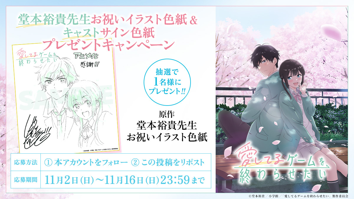 🌸••┈┈┈┈┈┈┈ プレゼントキャンペーン ┈┈┈┈┈┈┈••🌸 原作・ #堂本裕貴 先生のお祝いイラスト色紙を 1名様にプレゼント✨ 🎁応募方法 ①@aishiterugame をフォロー ②本投稿を11/16(日)23:59までにリポスト #愛してるゲームを終わらせたい
