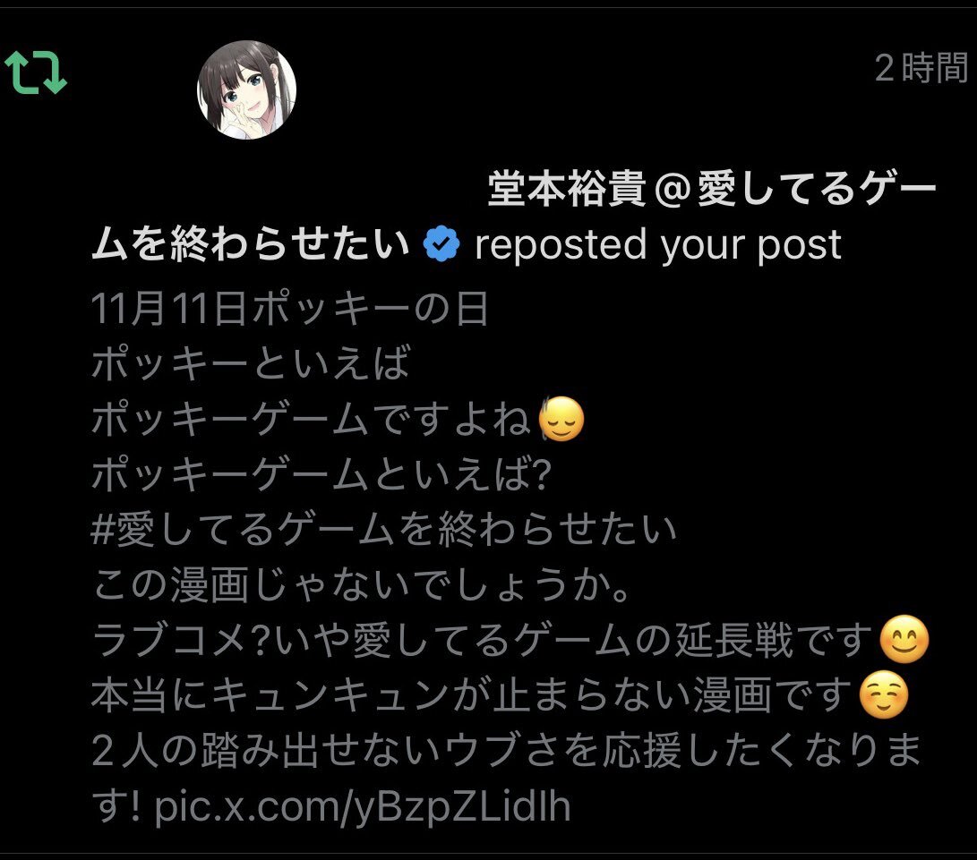 ポッキーの日にこの話見れて最高です🥹 初めてこのお話みたときひとりでにやにやしてました😇 アニメでこのお話みれるかなぁー🫶🏻🫶🏻 #ポッキーの日 #愛してるゲームを終わらせたい x.com/domoto64/statu…