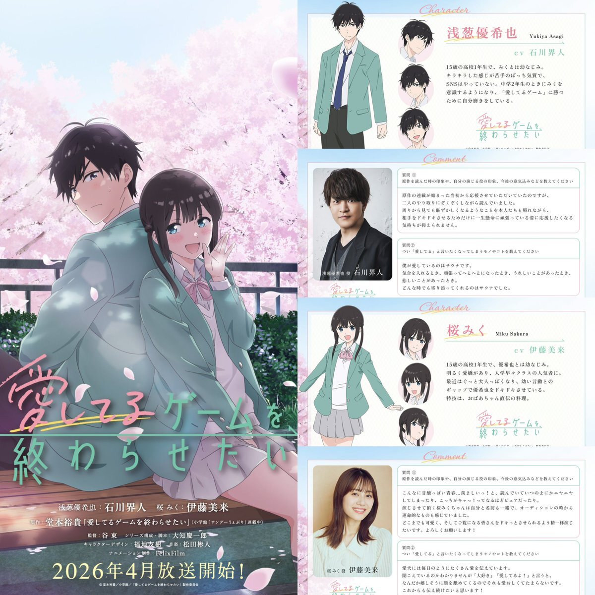zmedia.jp/game/677560/ 「愛してるゲームを終わらせたい」26年4月放送開始 浅葱優希也役に石川界人、桜みく役に伊藤美来 堂本裕貴氏の青春恋愛漫画をテレビアニメ化する「愛してるゲームを終わらせたい」の放送が、2026年4月からスタートすることが決 …