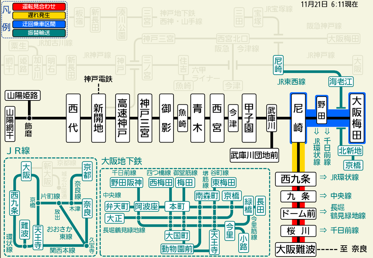 【2025年11月21日 06時11分現在】(1/2) 振替輸送について ・JR大阪環状線 ・JR東西線 京橋⇔尼崎 ・JR関西本線 木津⇔難波 ・JRおおさか東線 放出⇔久宝寺 ・JR奈良線 京都⇔木津 ・JR片町線 京橋⇔木津 ・御堂筋線 梅田⇔天王寺 ・谷町線 東梅田⇔天王寺 pic.x.com/4BI2n29MQ4