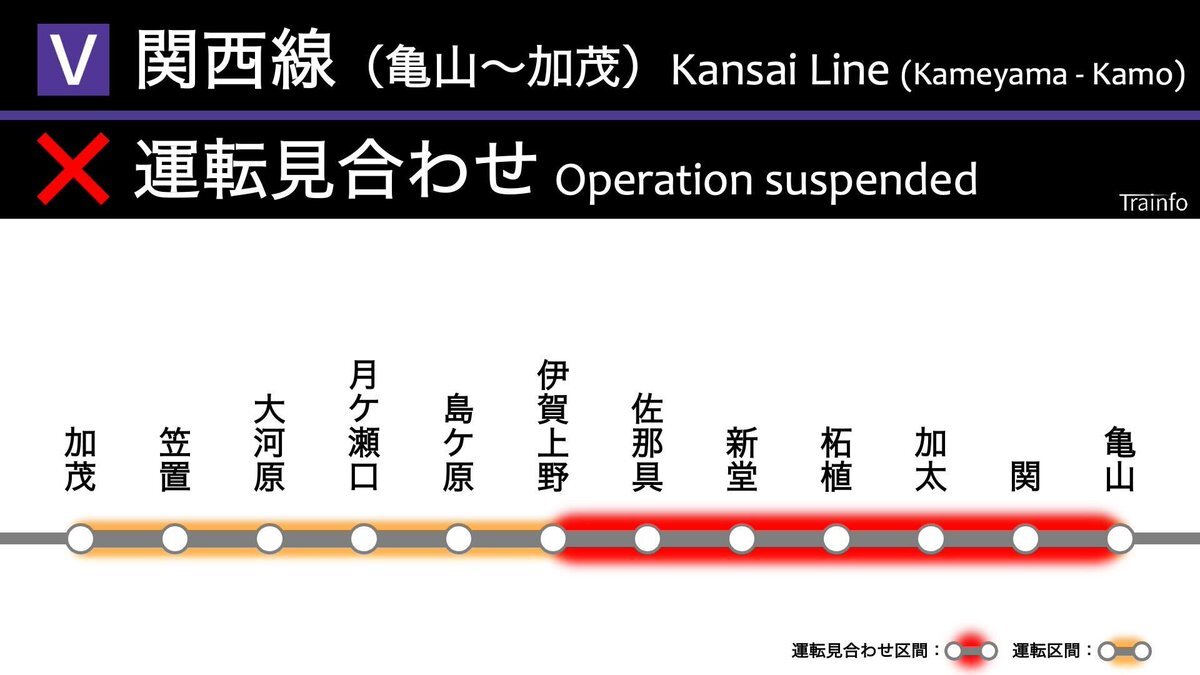 【関西線(亀山〜伊賀上野) 上下線 一部運休】 関西本線は、保守工事の影響で、以下の列車が亀山〜伊賀上野で区間運休となっています。 ★バス代行輸送利用可能★ 伊賀上野駅8:54・10:19・11:21・12:21・13:21発 亀山行 亀山駅9:09・10:14・11:14・12:14・13:14発 加茂行 pic.x.com/cUnjwA7M9t