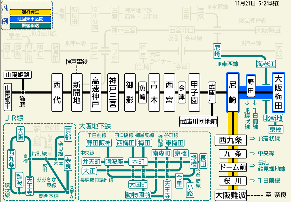 【2025年11月21日 06時12分現在】(1/2) 振替輸送について ・JR大阪環状線 ・JR東西線 京橋⇔尼崎 ・JR関西本線 木津⇔難波 ・JRおおさか東線 放出⇔久宝寺 ・JR奈良線 京都⇔木津 ・JR片町線 京橋⇔木津 ・御堂筋線 梅田⇔天王寺 ・谷町線 東梅田⇔天王寺 pic.x.com/bkQlQctkSP