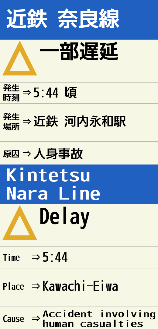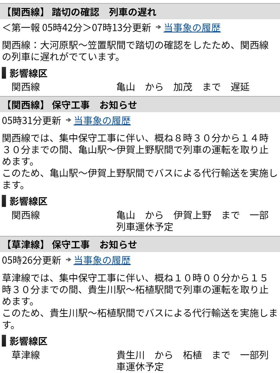 🚃 鉄道運行情報 🚃 関西本線[亀山~加茂] 列車遅延 05:42頃、大河原~笠置駅間での踏切内点検の影響で、一部列車に遅れが出ています。