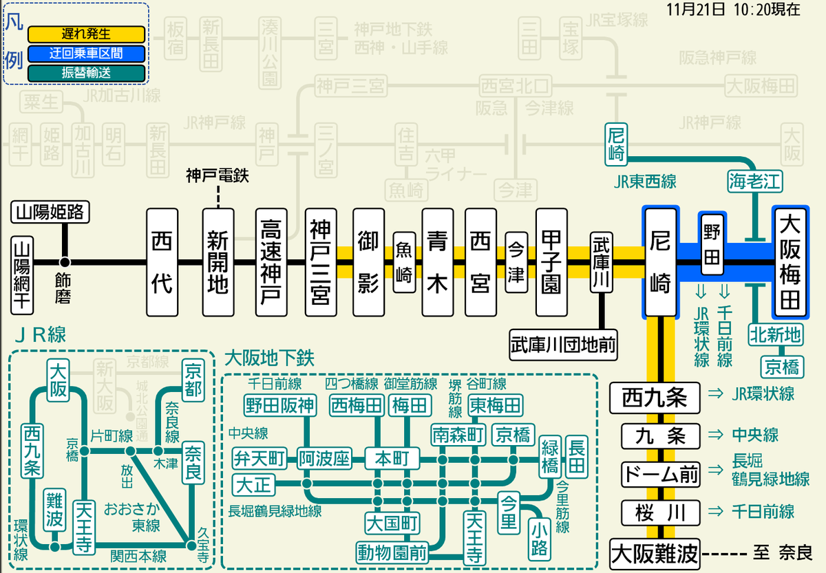 【2025年11月21日 09時46分現在】(1/2) 振替輸送について ・JR大阪環状線 ・JR東西線 京橋⇔尼崎 ・JR関西本線 木津⇔難波 ・JRおおさか東線 放出⇔久宝寺 ・JR奈良線 京都⇔木津 ・JR片町線 京橋⇔木津 ・御堂筋線 梅田⇔天王寺 ・谷町線 東梅田⇔天王寺 pic.x.com/vNd7Ys0841