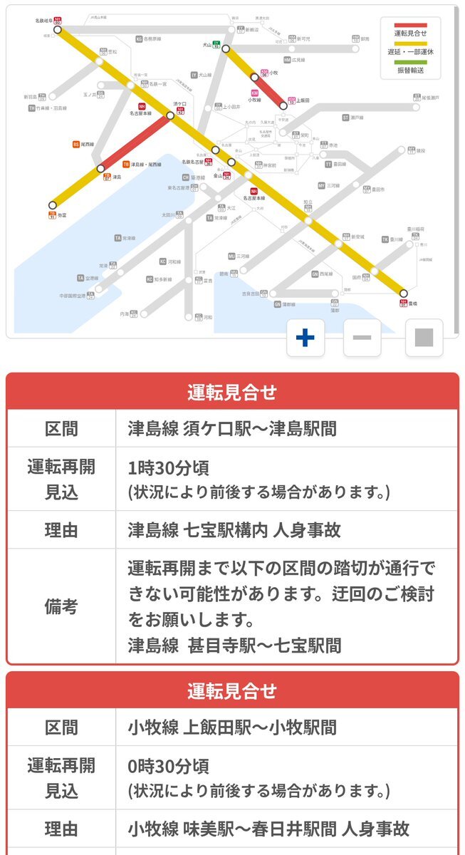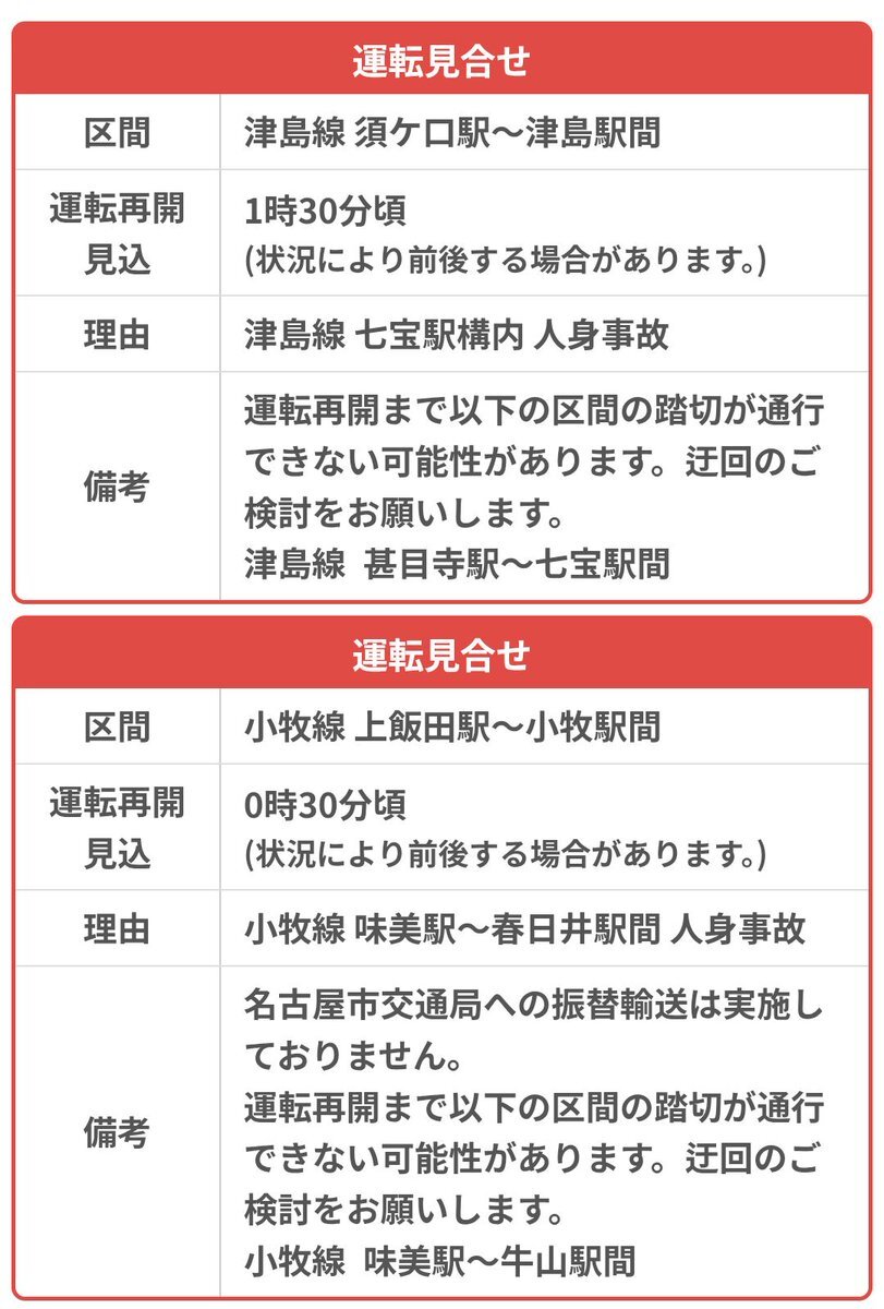 名鉄、こんな時間に小牧線と津島線でのダブル人身事故… pic.x.com/D47PiOQ3CL