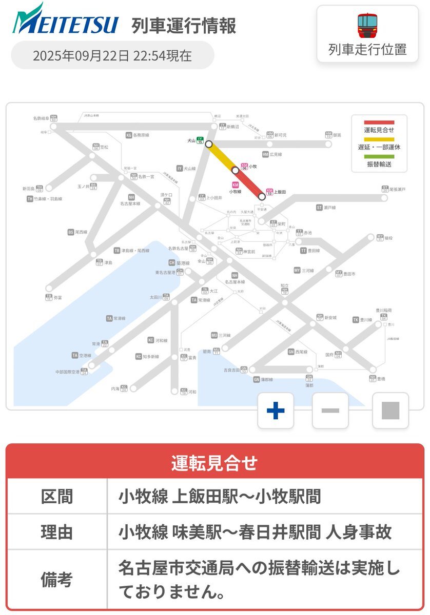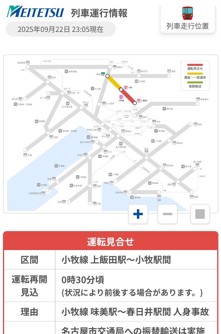 小牧線 味美駅~春日井駅間 人身事故のため、小牧線 上飯田駅~小牧駅間で運転を見合わせております。運転再開見込みは00時30分頃です。(2025/9/22 23:05) 詳しくはこちら→top.meitetsu.co.jp/em/