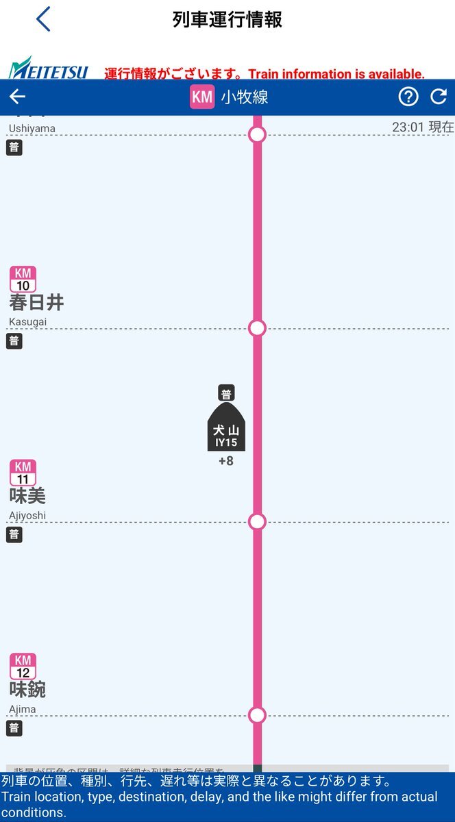 #名鉄 運転見合せ 区間 : 小牧線 上飯田駅~小牧駅間 運転再開見込 : 0時30分頃(状況により前後する場合があります) 理由 : 小牧線 味美駅~春日井駅間 人身事故 深夜になります、名鉄の運行情報に注意して下さい