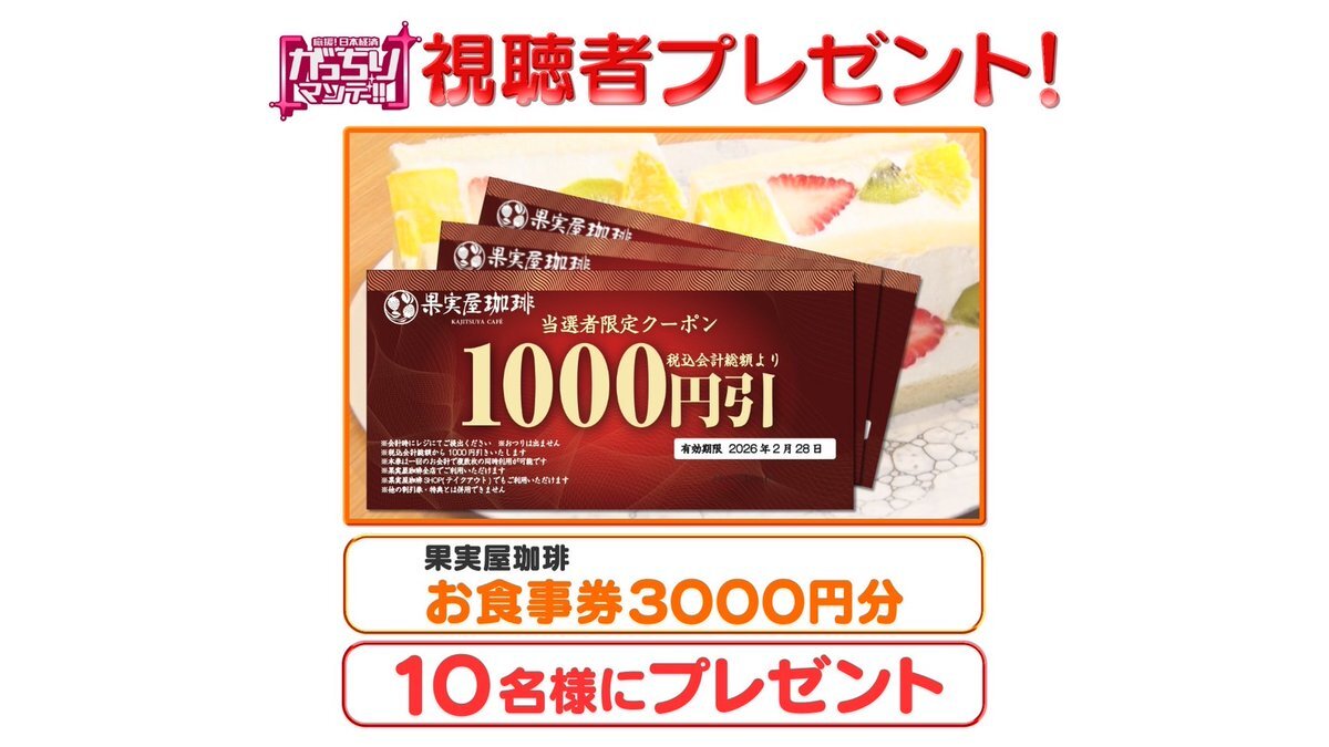 \#プレゼント企画 ①🎁/ #がっちりマンデー ‼︎ 11/30(日)放送『儲かる!地元喫茶店』に登場の果実屋珈琲「食事券3000円分」を10名様に #プレゼント 〆切 12/2(火)迄 🚩応募方法 ①このアカウントをフォロー ②このポストをリポスト #懸賞 #キャンペーン #tbs