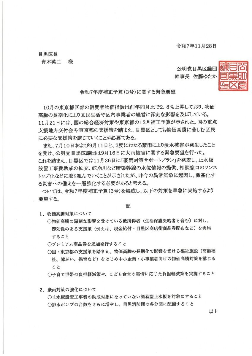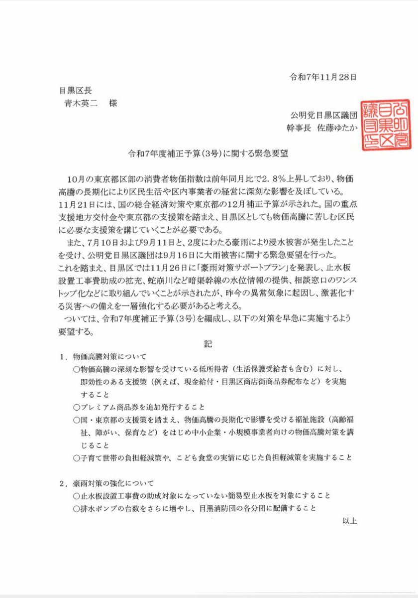 本日、公明党目黒区議団より、目黒区青木区長に、令和7年度補正予算(第3号)に関する緊急要望をしました。 長引く物価高で、区民生活や区内事業者の経営に深刻な影響があり、補正予算の編成に向け、街の皆様の声をお届けしました。 豪雨対策の強化も併せて要望しました。 youtube.com/shorts/ty5W-Io… pic.x.com/6G9WxP1tYx