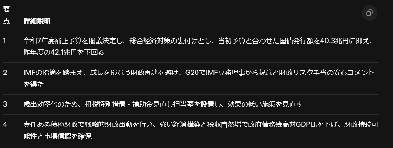 返信先:@takaichi_sanae日本政府は、令和7年度補正予算を閣議決定し、「力強い経済」を目指す総合経済対策を推進しています。財政の持続可能性にも配慮し、成長を促す財政出動を戦略的に行うことで、「強い経済」を構築し、税収増加と財政健全化を目指します。 💡📈