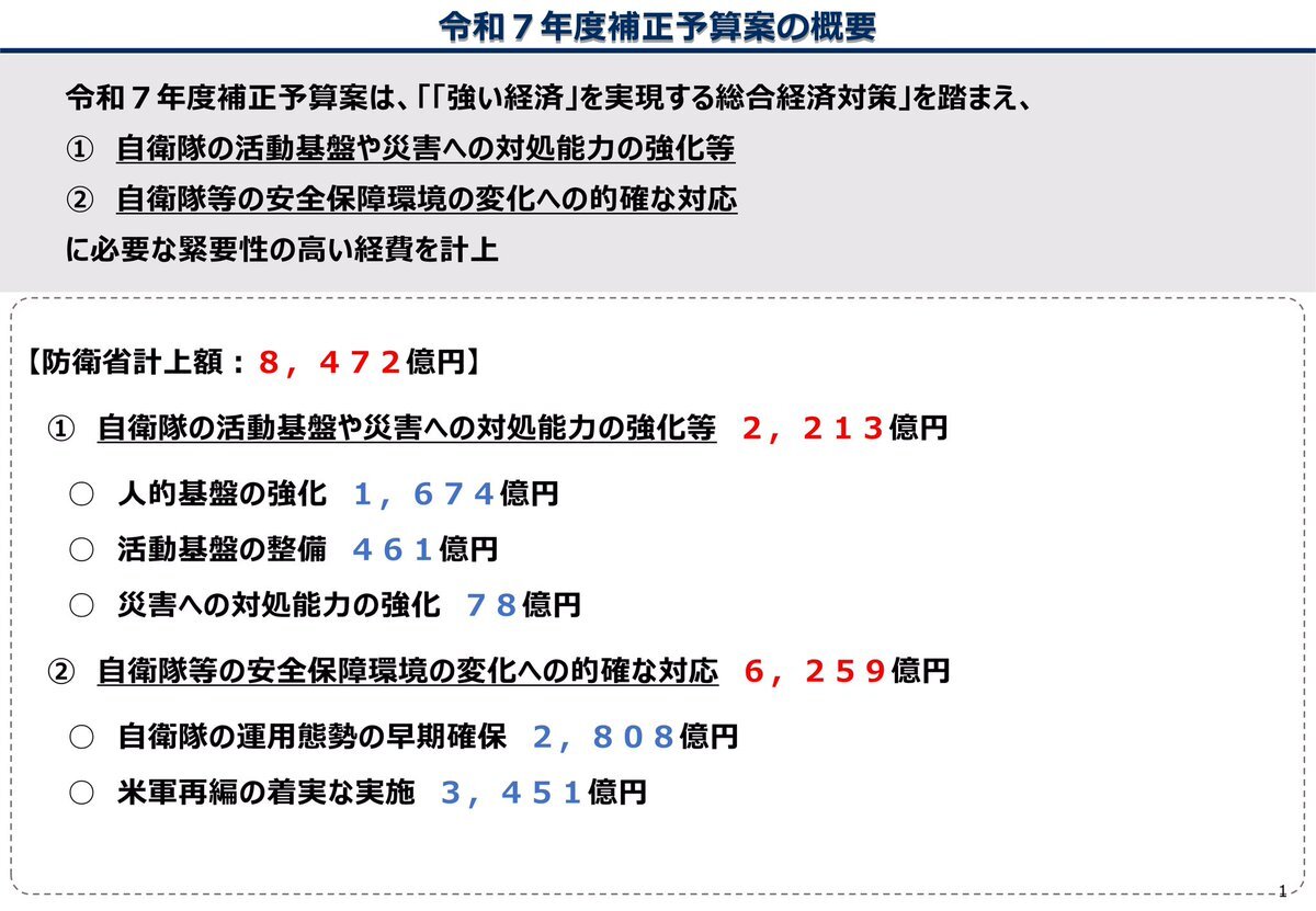 \11月28日、令和7年度補正予算案が閣議決定されました/ 防衛省は、特に緊急を要する以下の事業のため、8,472億円を計上しています。 ①自衛隊の活動基盤や災害への対処能力の強化など(2,213億円) ②安全保障環境の変化への的確な対応(6,259億円) mod.go.jp/j/budget/yosan… pic.x.com/FvdtxoOngj
