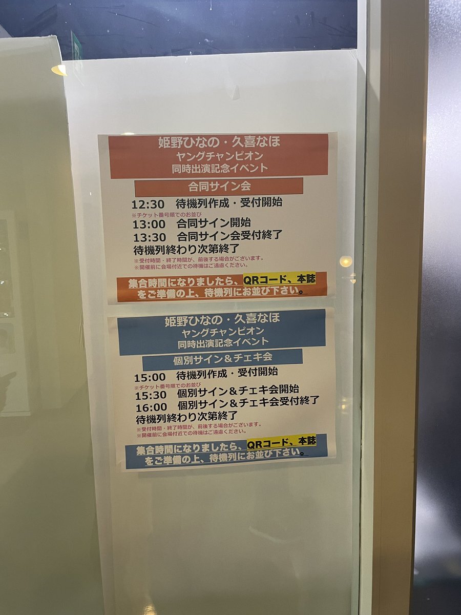 ヤングチャンピオン同時出演記念イベントのサイン会(1部)に行ってきました✨ 初ひなのになりましたね✨️ なほは前世からですが、久喜市くき親善大使就任後では初です。 別の観光大使をしてるから、いつか名刺交換したいですね😊 #ヤングチャンピオン #Mooove! #姫野ひなの #久喜なほ pic.x.com/PAH6qbksOR