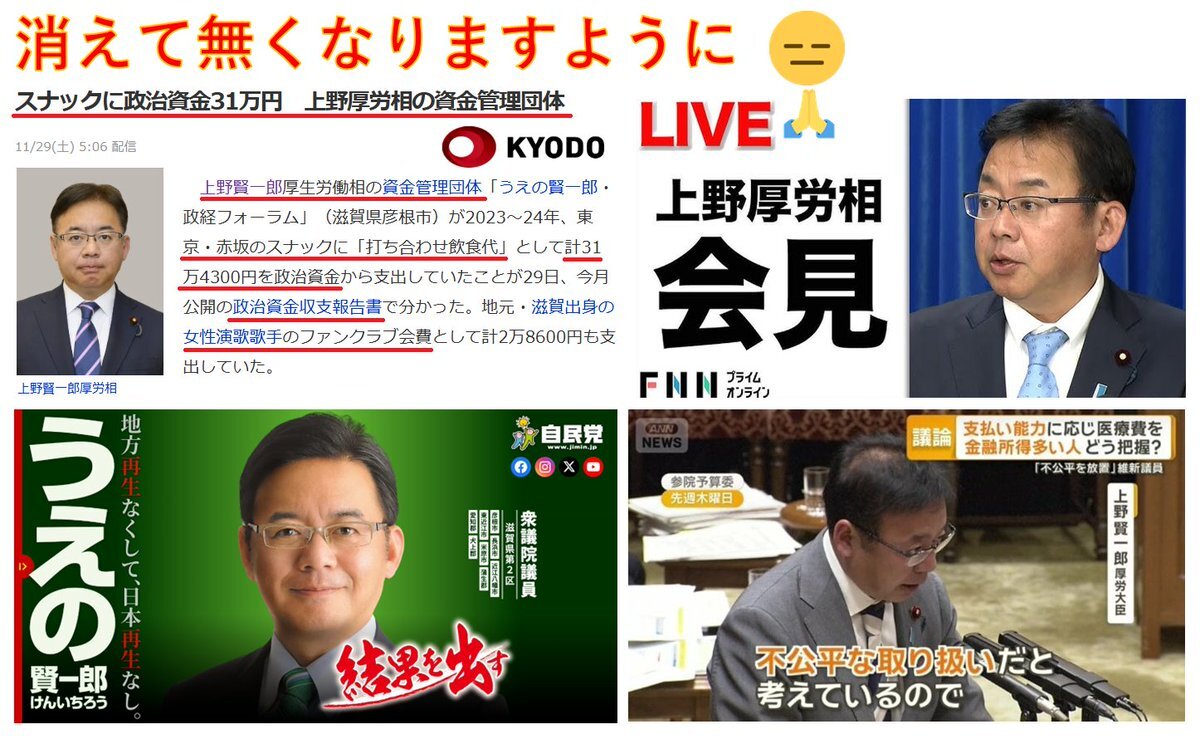 上野賢一郎厚労相の資金管理団体がスナックに政治資金31万円支出 歌手ファンクラブにも sankei.com/article/202511… via @Sankei_news #辞職案件 x.com/nagai_tomohiro…