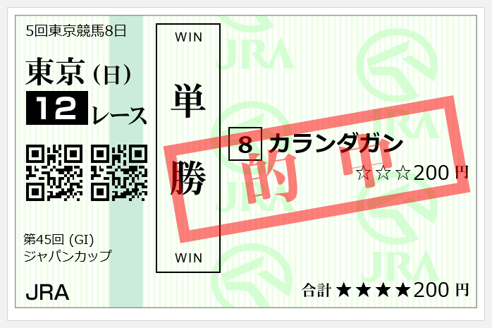 でも「ジャパンカップ」は、欧州年度代表馬クラスの馬が来れば、十分勝ち負けになることがわかったね。来年は指定レースを勝って「ジャパンカップ」にも勝てば12億円ももらえるのだから、欧州の強豪には是非とも来てもらいたいものだね。カランダガンは騙馬だから、来年も来てくれる可能性があるね。
