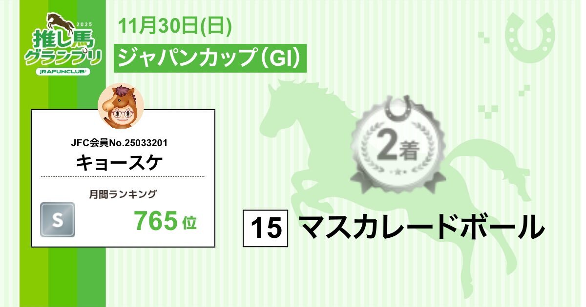 今週の #推し馬グランプリ 対象レースは #ジャパンカップ 私が予想した #マスカレードボール の結果! 過去19年、外国馬が勝ってなかったから「カランダガン でも...」と切ったのに。さすが欧州年度代表馬!強かった。 ↓推し馬グランプリはコチラ↓ club.jra-fun.jp/oshiuma/ pic.x.com/8AqimDTvDo