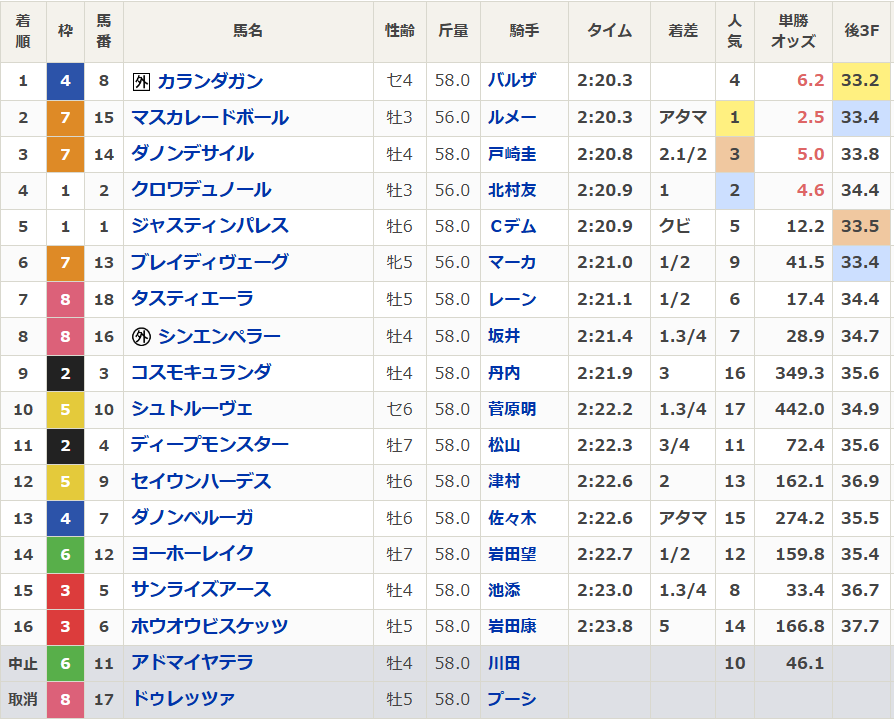 【#ジャパンカップ】 全着順、上がりタイム等はこちら。 race.netkeiba.com/race/result.ht… 日本の高速決着にも見事に対応。カランダガンが上がり33秒2の脚を使い、マスカレードボールとのマッチレースに勝利。