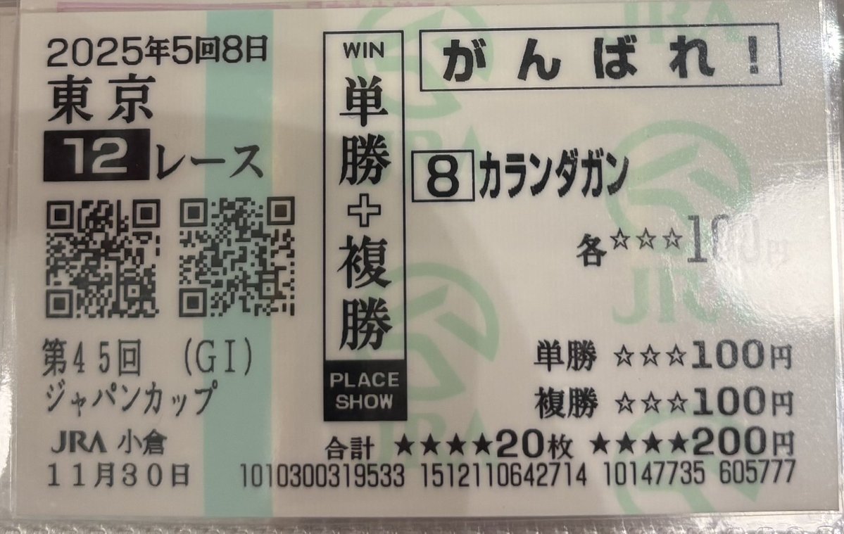 今年のジャパンCは事件が起き過ぎでしょ😅 勝ったカランダガンは、さすが欧州年度代表馬でしたね。 これで、欧州馬でも通用することを証明してくれたレースだったと思うます。 馬券は安いけど的中できました✌️ 京成杯は軸に迷った3頭の決着で、3連単も買ってればよかったと後悔😢 富田君ありがとう✨
