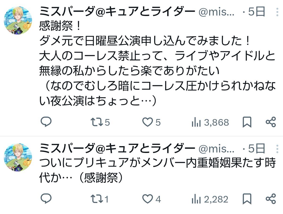 ⚠️注意喚起⚠️ プリキュア界隈の問題児、ミスパーダ。 キミプリ感謝祭に申し込んだ模様。 彼は『プリキュアがメンバー内重婚姻果たす時代が』と妄言を言ってた。 以前のプリキュアショーで、わけのわからない発言で『持ち物検査』に発展させた人です。 …抽選外れてほしい…大事が起きてからでは遅い。
