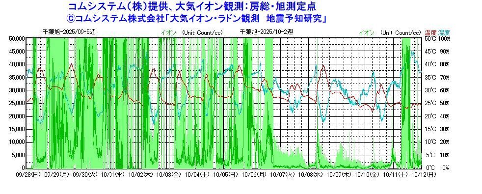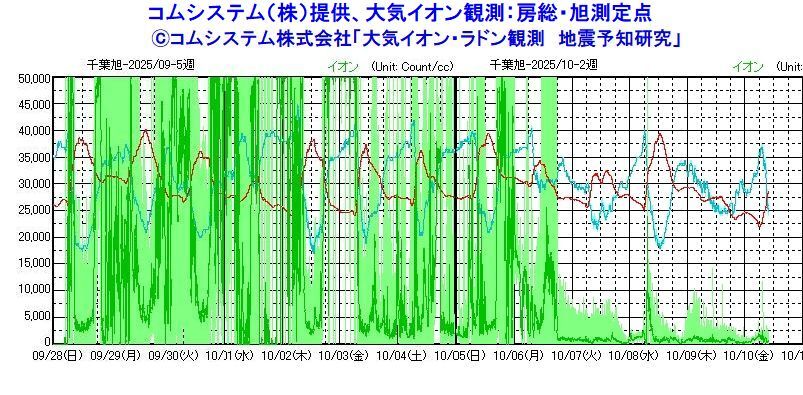 【要警戒継続】コムシステム(株)提供、大気イオン観測:房総・旭測定点 28日、29日、30日、10月01日~06日スケールアウト;07日8500;08日スケールアウト;09日14000;10日27500;11日スケールアウ(個/cc) 茨城県南部、千葉県北東部、千葉県東方沖付近を中心に注意継続 pic.x.com/HbieMlFyth
